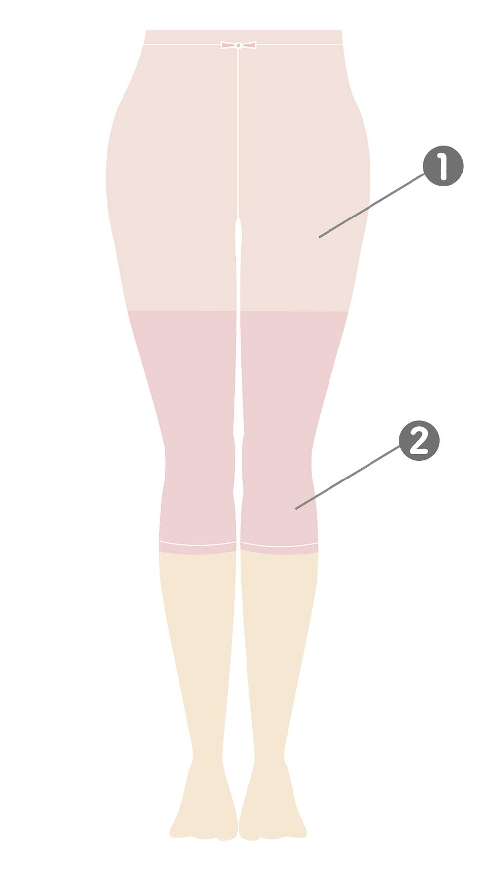 ①ヒップから太ももにかけては薄く大きく伸縮し、ズレを防止します。