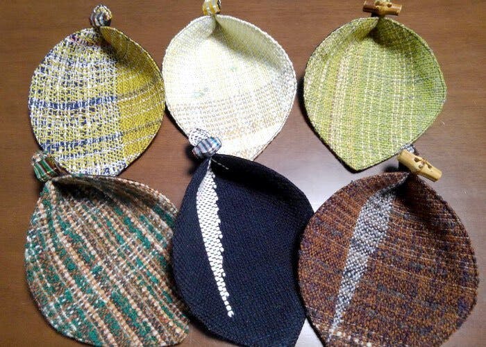さをり織りとは、自分の感じるままに織るという技法です。知的障害・精神障害のある作家が、足も使って大きな織り機で織っています。アクセサリーや腕時計を置く葉っぱのお皿です。丈夫ですので、玄関に飾って、カギやハンコを置いても。