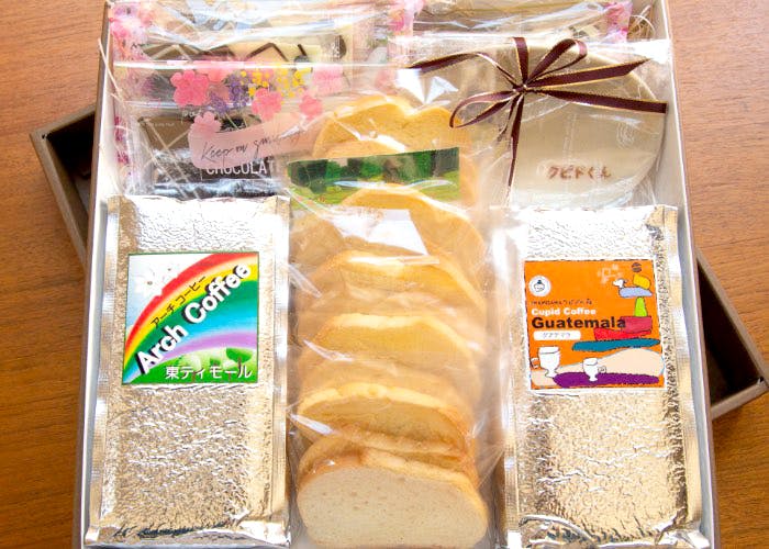 クピド・フェアで生産している、コーヒー豆、ラスク、クッキーなどを豪華な詰め合わせにしました。一つ一つ丁寧に作られた食品を、ぜひ味わってください。