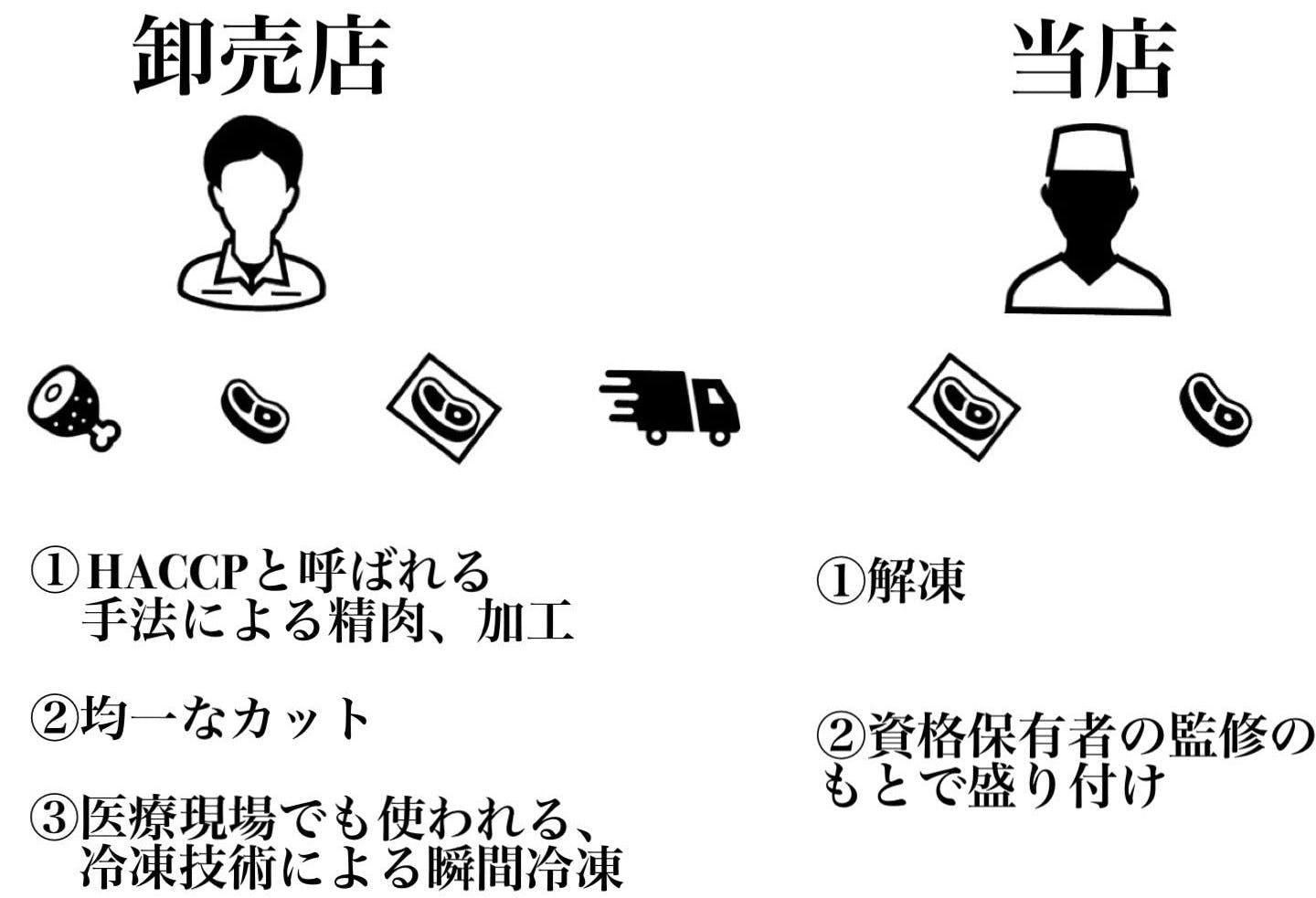 具体的な流れと致しましては、専門の卸売店に加工からカット、そして冷凍までの過程を全て委託します。当店では、解凍と盛り付けのみを行い、提供いたします。また、解凍と盛り付けに関しましても、「食品衛生責任者」の資格保有者が監修のもとで行います。