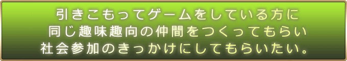 1.引きこもってゲームをしている方に同じ趣味趣向の仲間をつくってもらい、社会参加のきっかけにしてもらうこと。