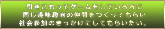 1.引きこもってゲームをしている方に同じ趣味趣向の仲間をつくってもらい、社会参加のきっかけにしてもらうこと。