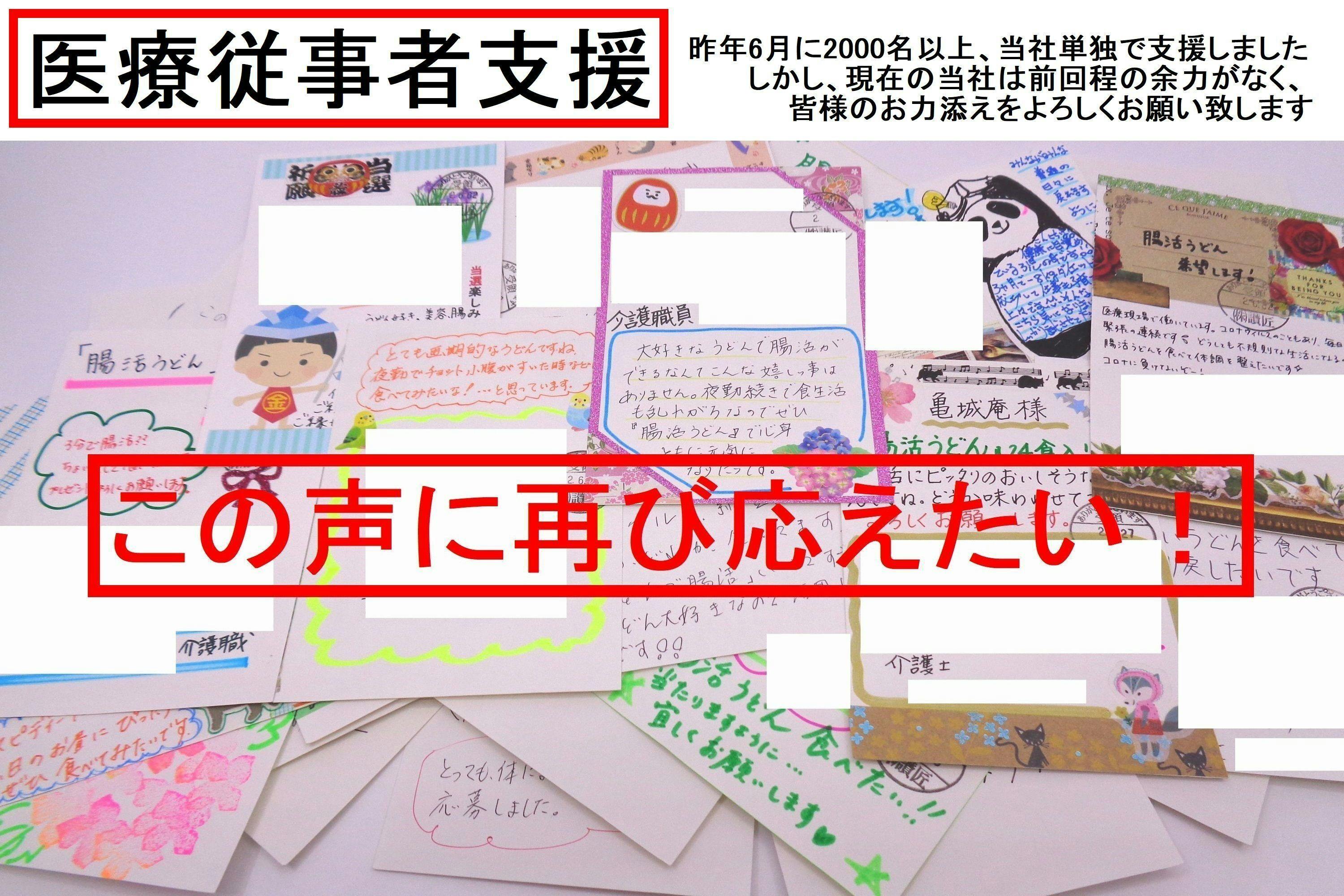 昨年6月のご支援で、当社の「腸活うどん」が多くの方に求められていること、本当に医療従事者の方に喜んで頂けたことを大変嬉しく思っておりました。しかしながら、想定以上のご応募の為、2週間の募集のところを4日間で止む無く募集を停止してしまったことにつきまして、まだまだ求められている方がいらっしゃるのにお届けできなかったこと、申し訳なく思っておりました。