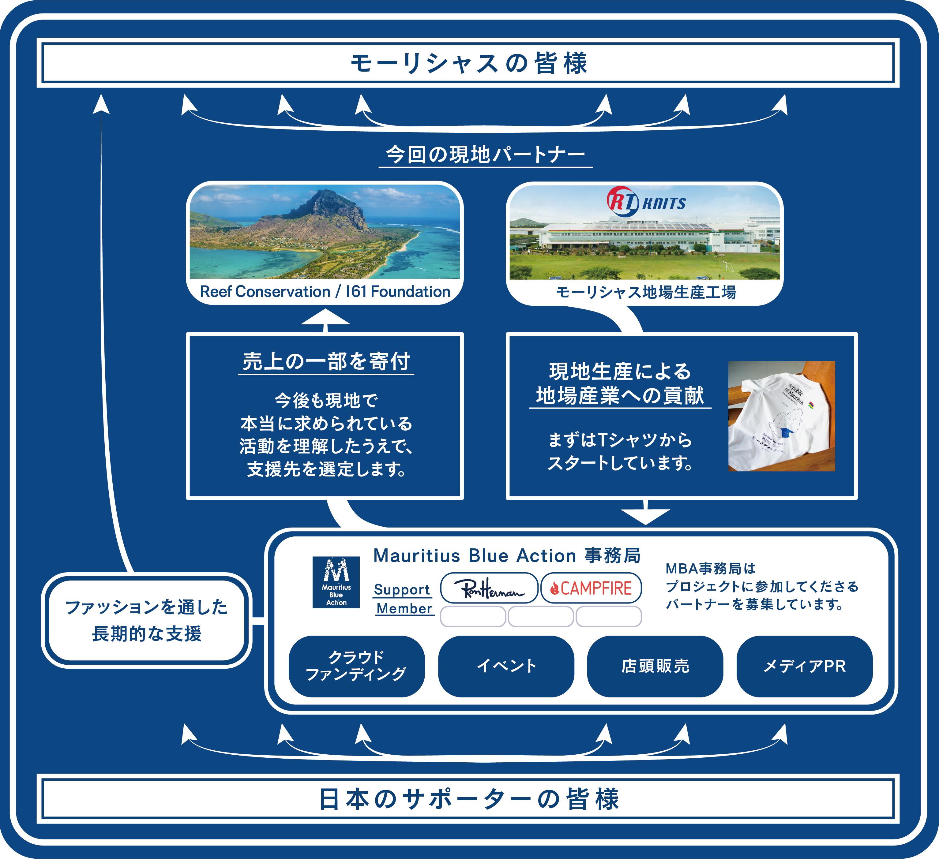 モーリシャス・ブルー・アクションは、一過性の寄付プロジェクトではなく、持続可能なムーブメントとして継続していくモデルを目指しています。モーリシャスに観光客がまた戻ってきてくれるためのPR活動や、サンゴやマングローブといった沿岸生態系の回復活動、漁民支援の状況など、支援者の方々へ定期的にモーリシャスの現状を伝え続けるとともに、さまざまなブランドとコラボレーションしたモーリシャス応援アイテムの製造・販売やイベントを仕掛けていくことで、モーリシャス支援の輪をファッションを通じて中長期的に広げていきます。