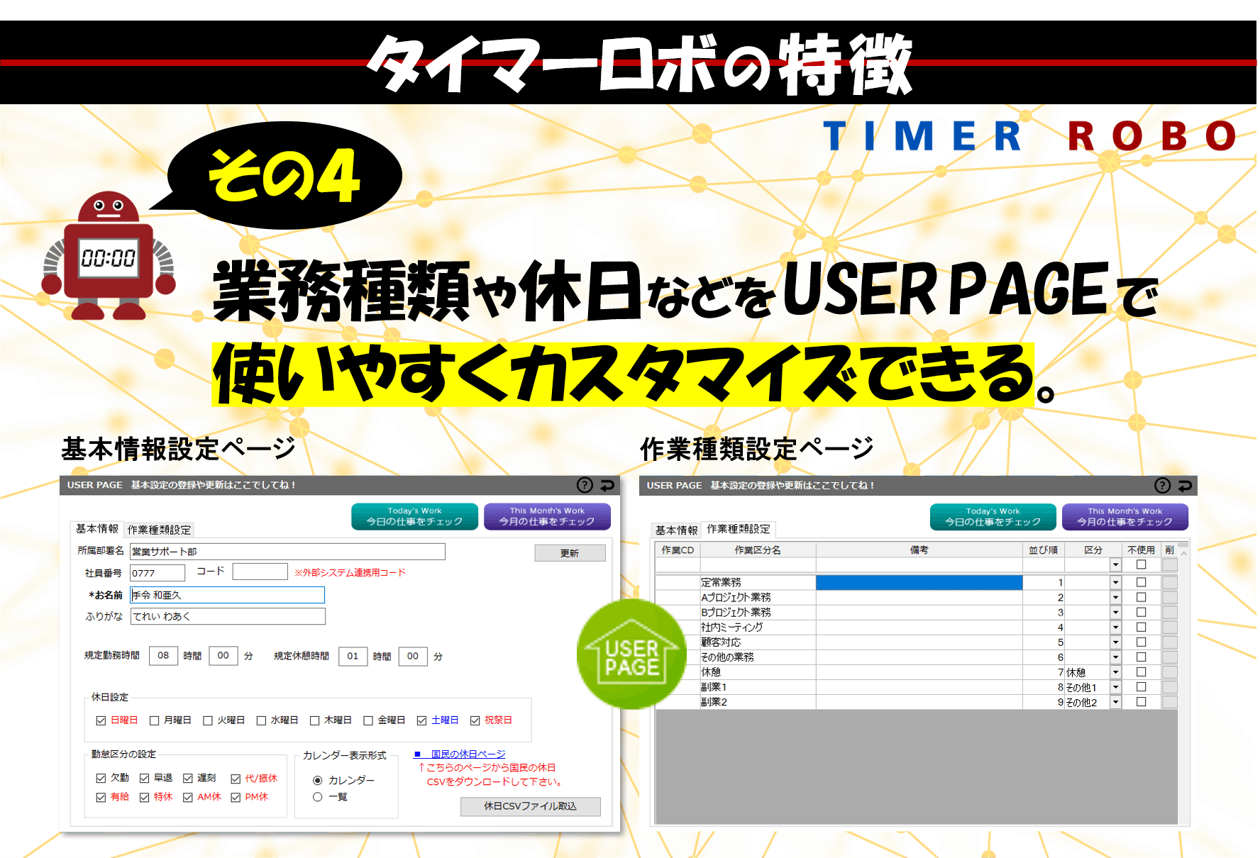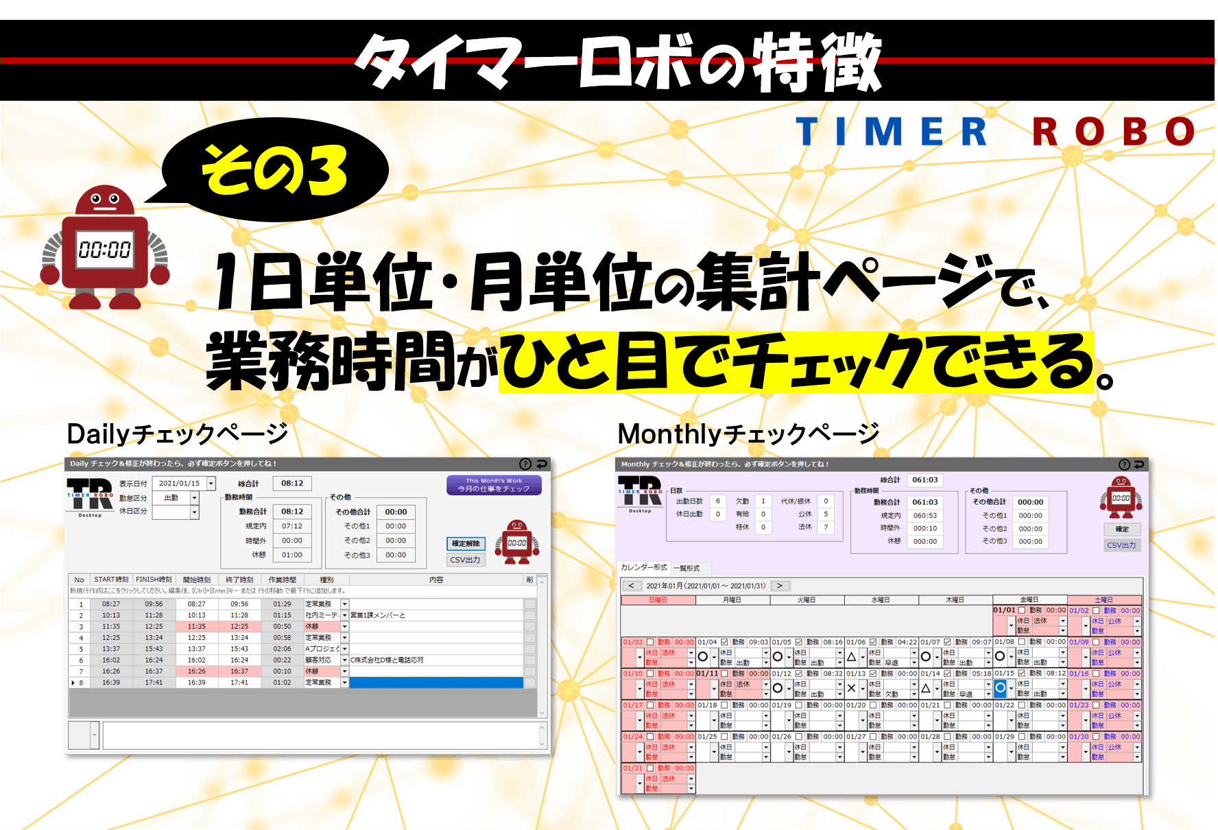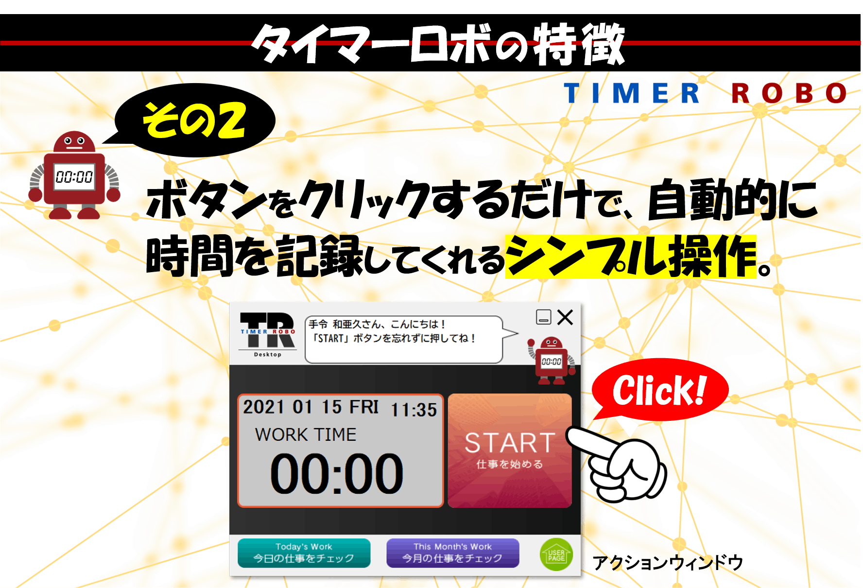 そのひとつが、このPC用時間管理ソフト[TIMER ROBO]です。企業側が一方的に管理するこれまでの勤怠管理ソフトとは違って、社員や委託先のパートナーの方々が、みずから進んで時間管理をしたくなるようなソフトにしたいとの願いを込めて開発しました。