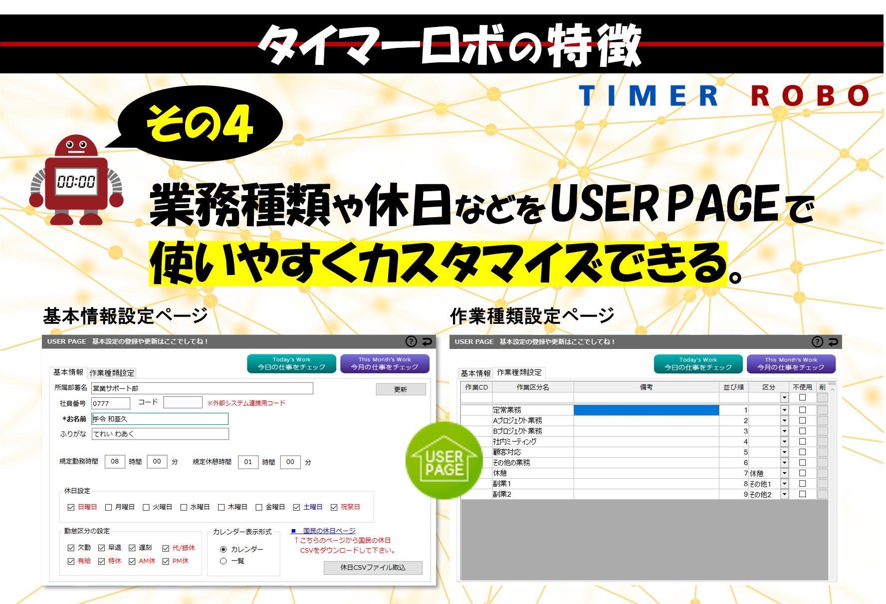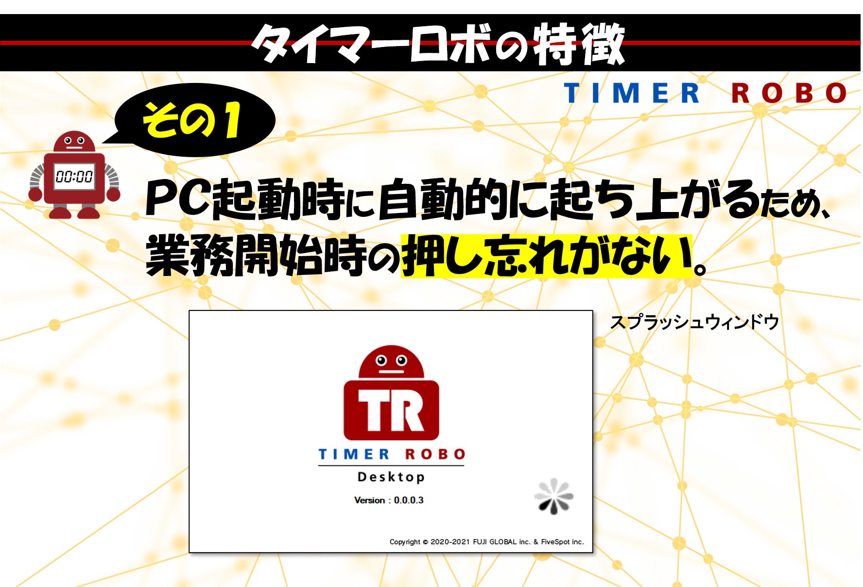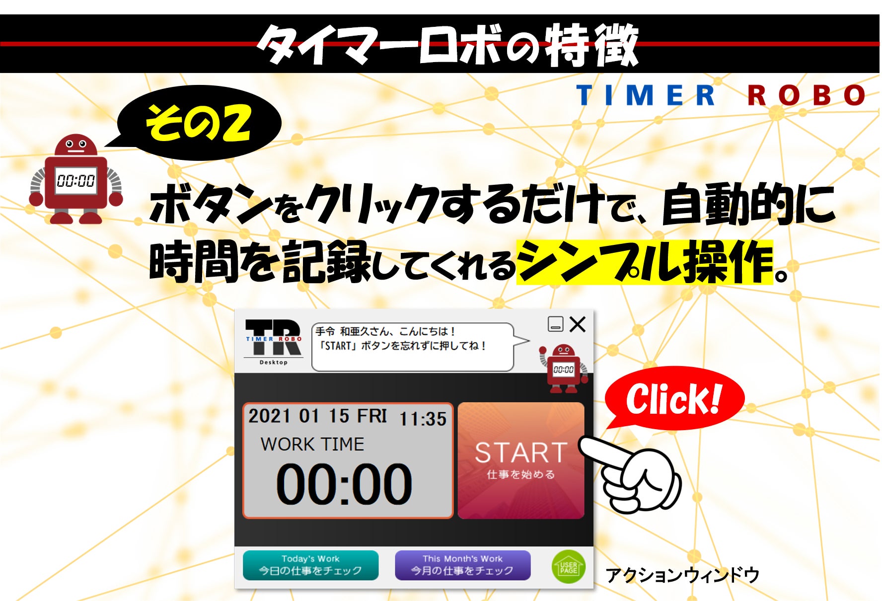 そのひとつが、このPC用時間管理ソフト[TIMER ROBO]です。企業側が一方的に管理するこれまでの勤怠管理ソフトとは違って、社員や委託先のパートナーの方々が、みずから進んで時間管理をしたくなるようなソフトにしたいとの願いを込めて開発しました。