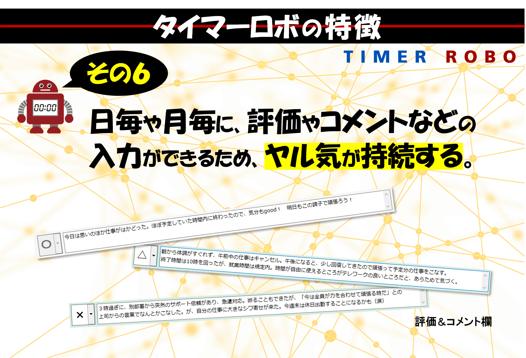 今回のTIMER ROBOは、あくまで自己管理のためのソフトです。ただ、業務に対するコメントや日々の気づきも入力できるため、日報・月報管理として、勤務者・管理者との双方向コミュニケーションツールとしても使用することができます。