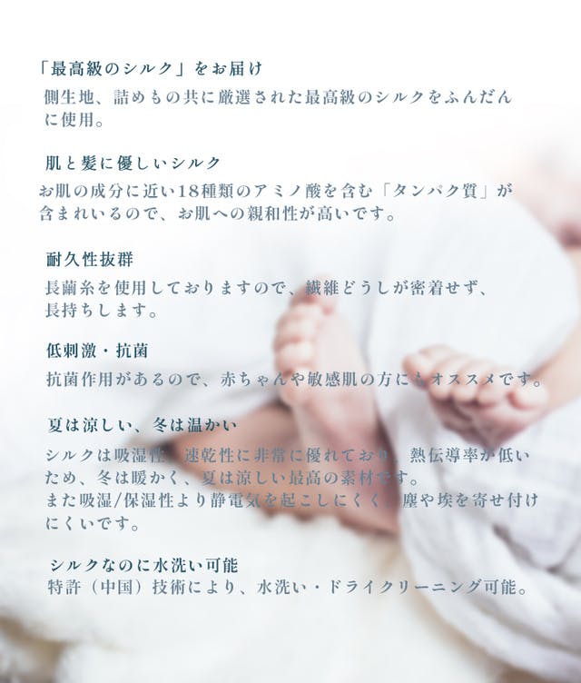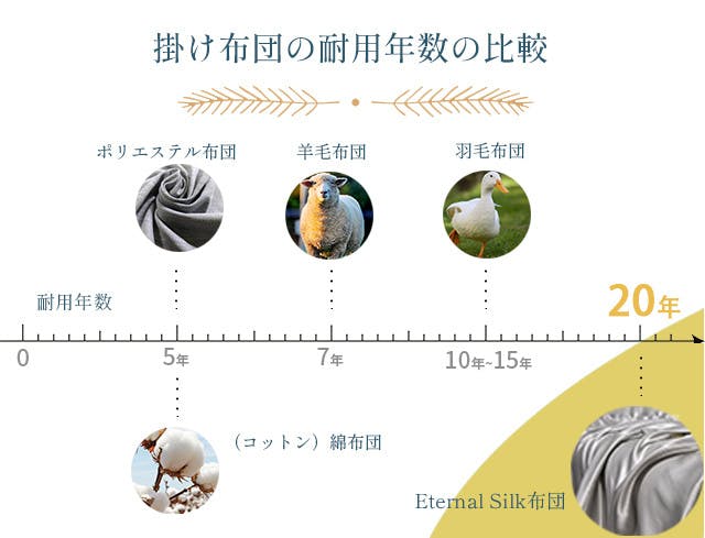 『Eternal Silk』はなんと20年以上という驚異の耐久性を持っているため、寝心地だけでなく、大事に長くご愛用いただけるような布団をを私たちは提供致します。