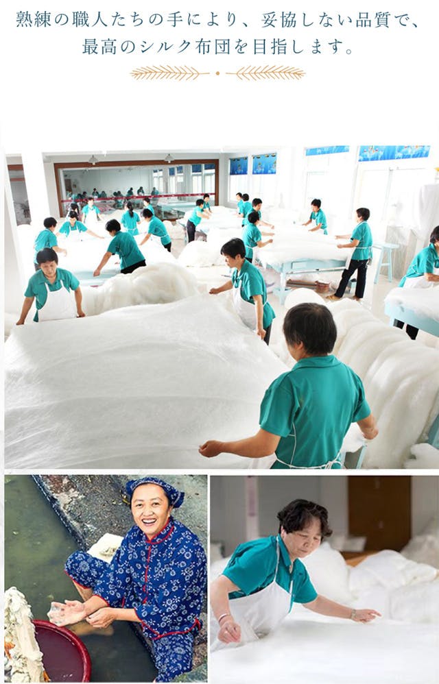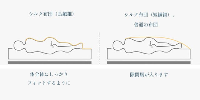 長繊維のシルク布団は体全体にフィットするので、短繊維のように隙間風が入りにくく、保温効果も抜群です。