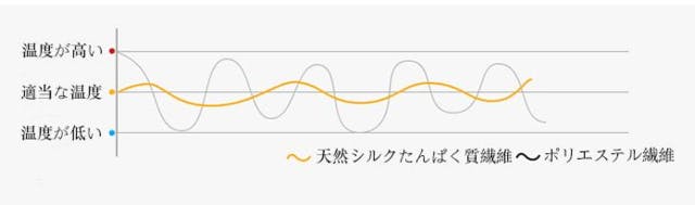 また繊維自体が微細な多孔質構造をしており、繊維と繊維の間に多くの空気を含んでいるため、空気の断熱効果があります。外気を体に伝えにくく、外の暑さ・寒さに影響されづらいので(熱伝導率が低い)、快適に保ちます。また保温性により、静電気が起こりにくいのもシルクのメリットです。