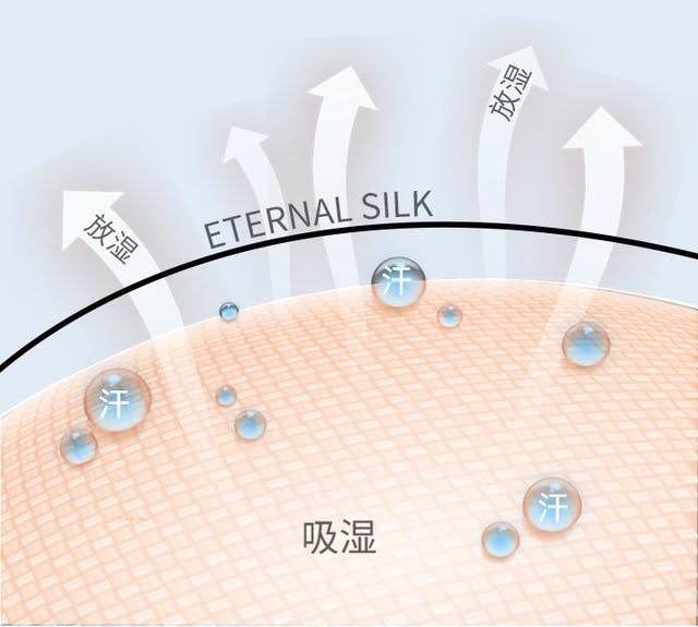 お布団の中の快適な温度は、33±1℃。 この温度をいかに実現して維持するかが「いい眠り」の大きなポイントです。『Eternal Silk』のように最高級のシルクを原料とするお布団は、どんな睡眠環境でも布団内の温度を32℃前後に保つことができます。