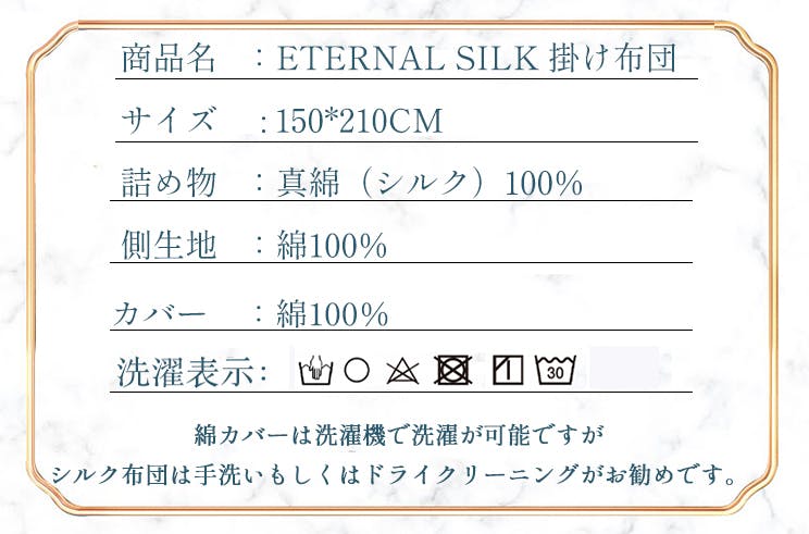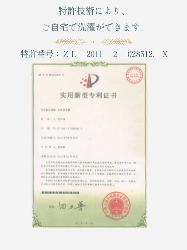 通常、高級シルク布団はご自宅での洗濯はできません。しかし『Eternal Silk』は水洗い可能です。もちろん、ドライクリーニングもできます。しかも特許(中国)まで取得しております。