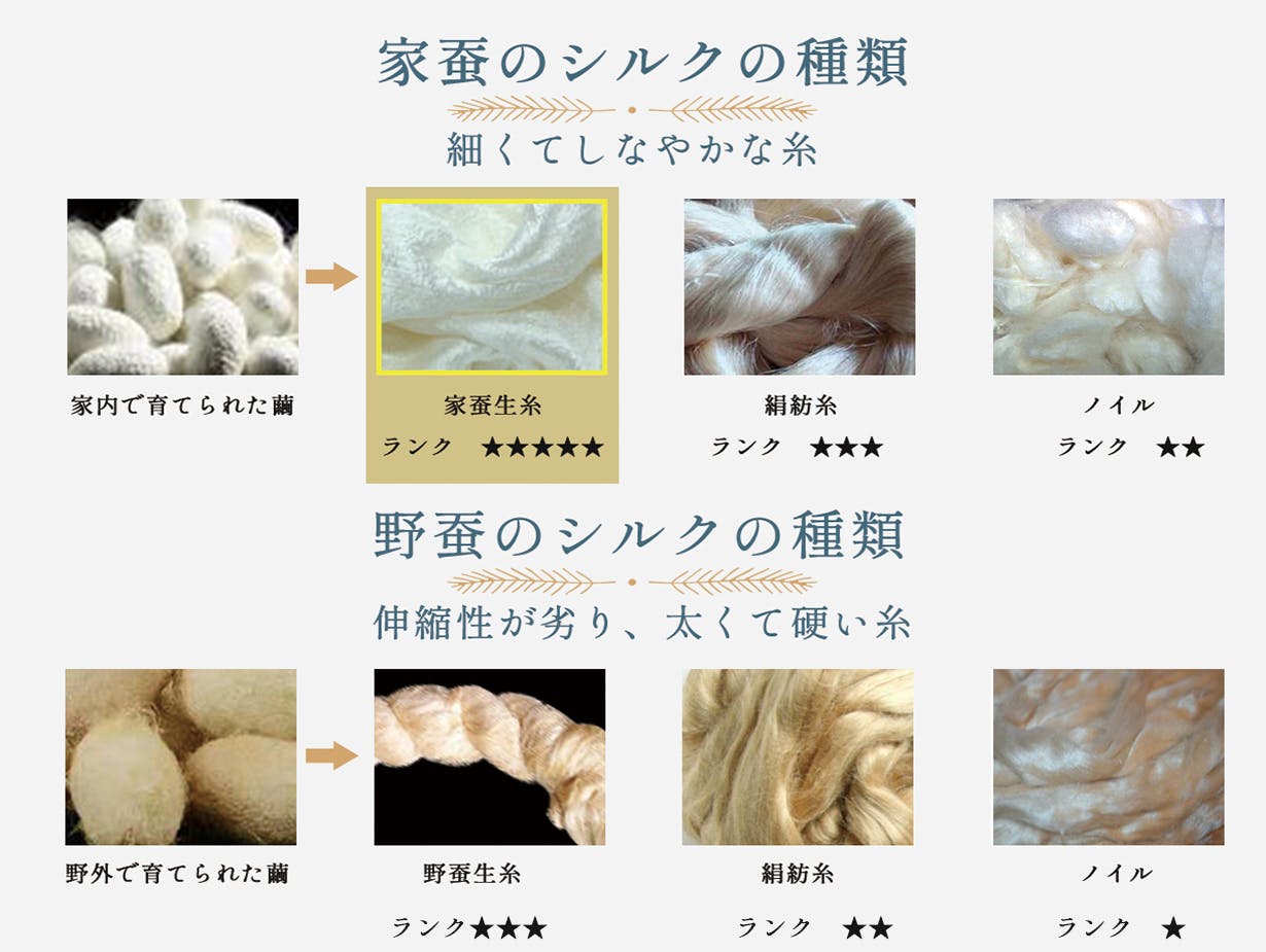 屋内で育てられた家蚕シルクと野外で育てられた野蚕シルクがあり、繊維の色合いや太さ、光沢感などによって細かく格付けされます。