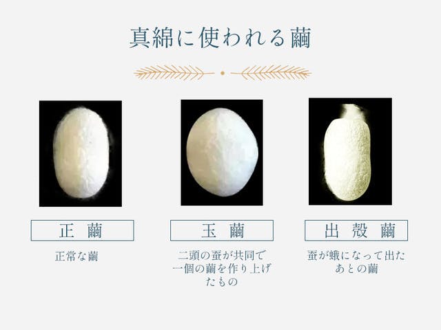 繭の種類は「正繭」以外に、繭から蛾が抜け出して大きな穴のあいた「出殻繭」や、2匹以上の蚕が共同して1つの繭をつくった「玉繭」などがあります。「正繭」以外の繭やつぶれたり汚れた繭は、生糸の製造に適さないため出荷する前に取り除かれます。これらが真綿の原料となるのです。しかし、品質のよい真綿には正繭が使われます。『Eternal Silk』で使われている真綿は100%「正繭」です。
