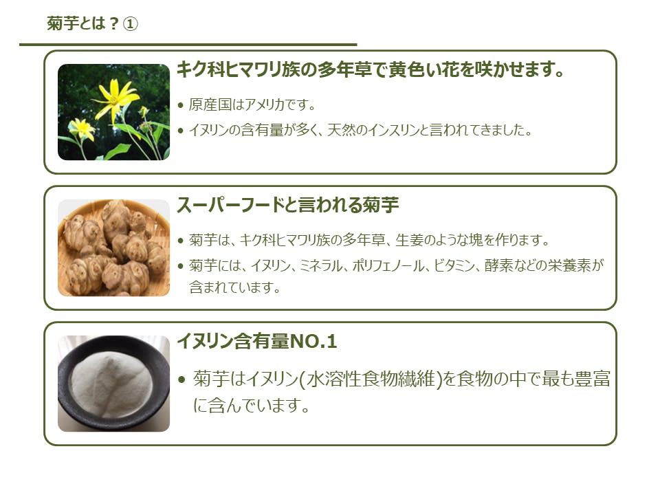 実は、4年前まで私は、120㎏体重があり、病院の血液検査で10個位要検査項目がありました。その時に菊芋と衝撃的な出会いをしました。何をやっても体重が減らない、ダイエットする度にリバウンドを繰り返していましたが、菊芋から濃縮・乾燥させたイヌリン(水溶性食物繊維)を1日3回、食前に5g以上飲み始めたところ、今では体重85㎏を切るまでになりました。(これはあくまでも個人の感想です)。すっかり元気になった自分の実体験を同じような事で悩んでいらっしゃる方にもお勧めしたいと思い、それから菊芋を深く勉強し、研究し、開発した結果、ここまで来ました。