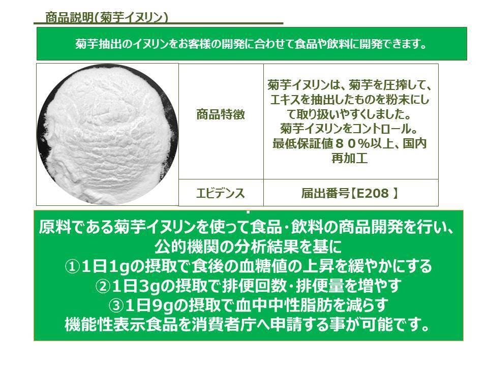 私共の原料は、菊芋を濃縮・乾燥させたものからイヌリン(水溶性食物繊維)を80%以上の高濃度で抽出した原料を国内のご協力頂いている製造工場にて飲料や食品やサプリメントに更に加工しています。