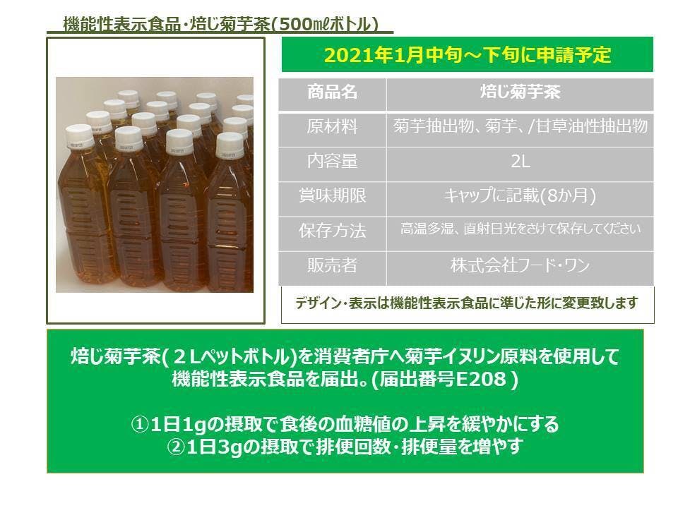 2021/01/25 15:00焙じ菊芋茶の500mlペットボトルのイヌリン(総フラクタン)の含有量が公的機関で正式に確認できました。これで、予定通り、焙じ菊芋茶の500mlと2Lの商品は、機能性表示食品を謳うことが出来ます。また、このプロジェクトを成功させるため、皆様のお力添え、ご支援をお待ちしております。宜しくお願い申し上げます。 もっと見る