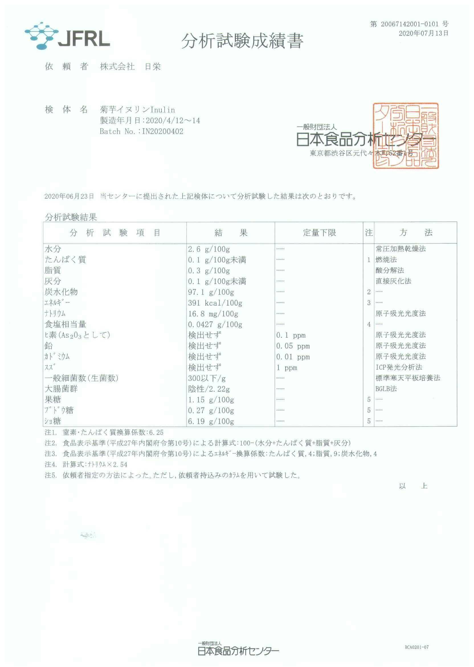 お客様の安心・安全の為に、弊社へ納入して頂いているお取引様から、加工する前に、成分分析、重金属検査、細菌検査、イヌリンの含有量を調べて頂いてから原料を納入して頂いています。