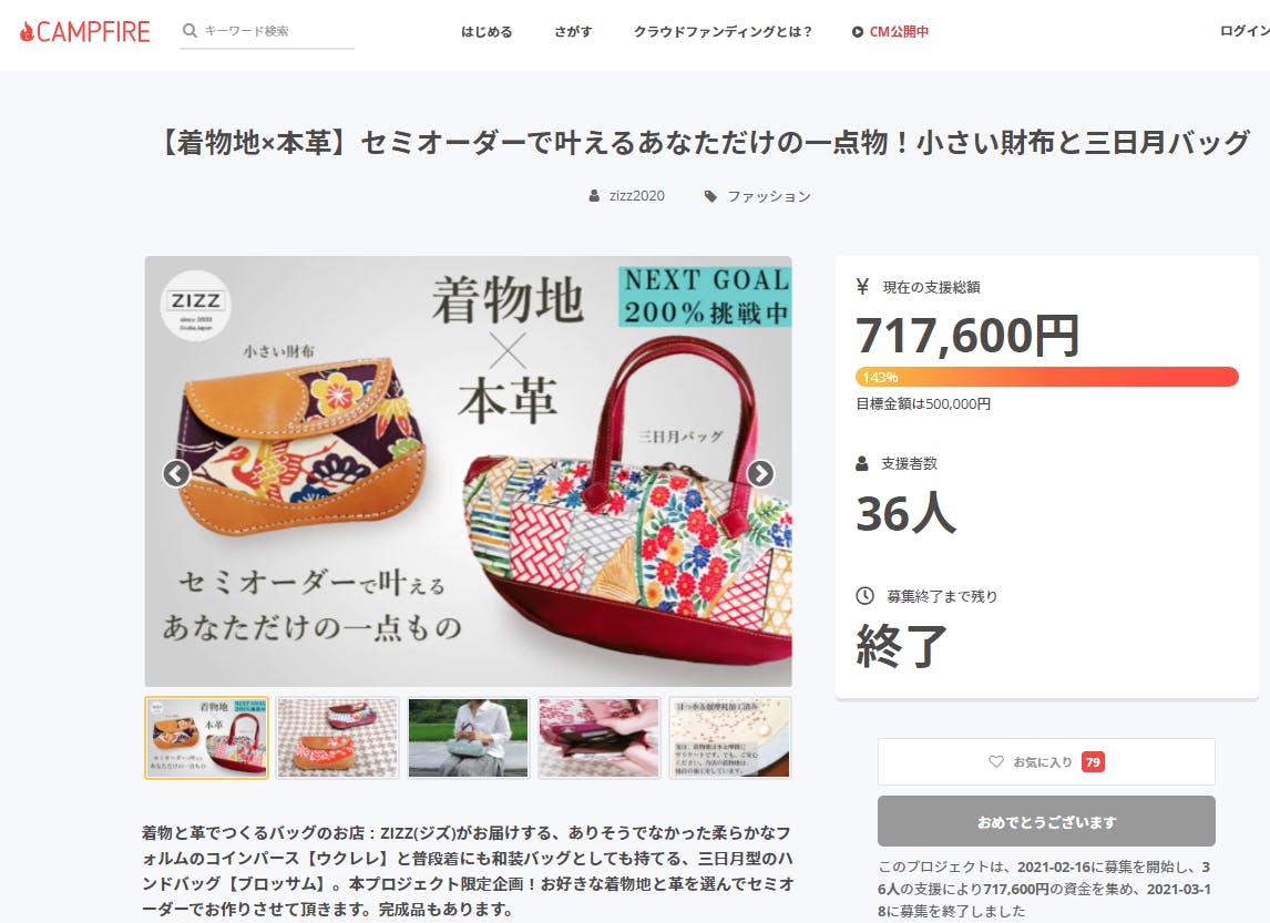 2021/03/19 16:04こんにちわ店長のフシイです。クラウドファンディングが終了しました。たくさんの方から応援をいただき143%達成させて頂きました。本当にありがとうございます!先ほど、支援者さまのデータをダウンロードしました。昔からのお客さまや、知り合いの方、ココイロでZIZZの事を知って下さった方、新規のお客さま。。。本当に有難いなーと、パソコンの前でウルウルしてしましました。年を取ると涙腺がゆるくなります。中には、上乗せ支援をして下さっている方がいて下さり、びっくりすると共に、頑張らねばと身が引き締まりました。これからも、お客さまが使って”楽しい”と感じれる商品をお届けできるように精進します。今後とも、ZIZZを、店長フシイをどうぞよろしくお願いいたします。↓↓夏頃に発売予定のハーフウォレットです。新作ハーフウォレットの発売に関しては、公式LINEアカウントにてお知らせさせて頂きます。次回のクラウドファンディングのお知らせもさせて頂きます。ぜひ、ご登録ください。登録はこちら→ https://lin.ee/f1nBhG3<百貨店催事のお知らせ>近鉄百貨店 上本町店さんに1週間 初出店!!↓↓★百貨店催事のお知らせ;────────────────────────────────2021/03/24(水)→03/30(火)近鉄百貨店 上本町店 8F 特設会場★期間中、お買い上げ頂いた方全員に”春の着物地小物”をプレゼントします。※期間中、新型コロナウイルス感染拡大の状況次第で、臨時休業または営業時間変更になる場合があります。催事期間中のオンライン、実店舗の営業は以下です。↓↓────────────────────────────────<中津のお店の営業>3/19(金)→4/6(火)までお休みとなります。4/7(水)より通常営業を再開します。<通販サイトについて>3/19(金)より、発送のみお休みとなります。お問い合わせへのお返事や、注文処理は普段どうり行います。3/19(金)から頂いたご注文は4/3(土)より順次発送させて頂きます。<オンライン接客・着物地サンプル送付サービスについて>3/19(金)より一旦おやすみを頂き、4/7(水)より再開予定です。※試着サービスについては、いろいろ検討した結果一旦休止とさせていただきます。よろしくお願いいたします。────────────────────────────────ご無理のない範囲でご来店頂けると嬉しいです。心よりお待ちしております。この度は、1か月にわたりクラウドファンディングの活動報告にお付き合い頂きましてありがとうございました。 もっと見る