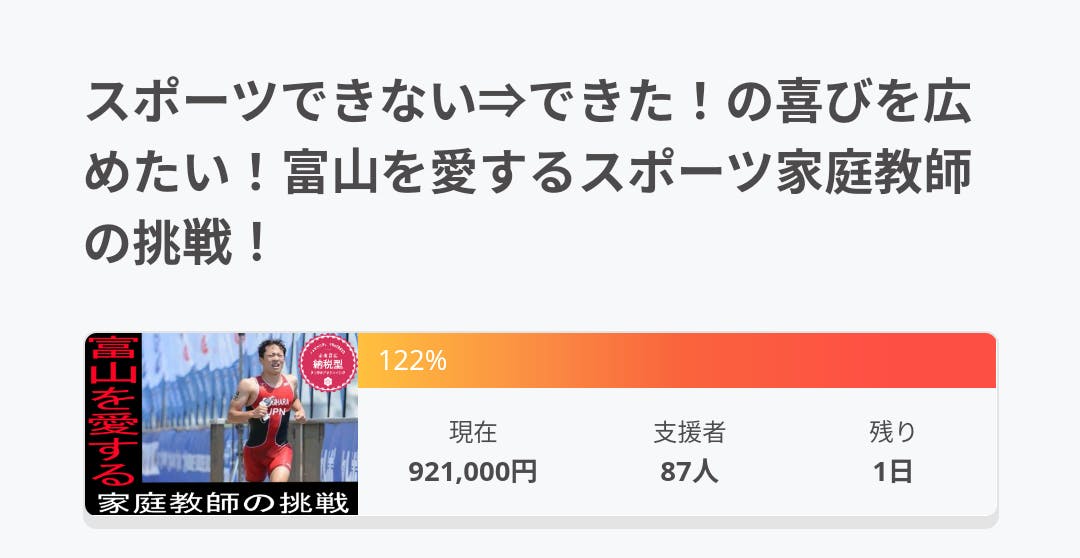 2021/02/27 07:45ついに最終日です!ネクストゴール目標の100万円まで残り7.9万円!ここまで来たらやるしかない!あと少しのお力をいただきたく、宜しくお願いします!! もっと見る