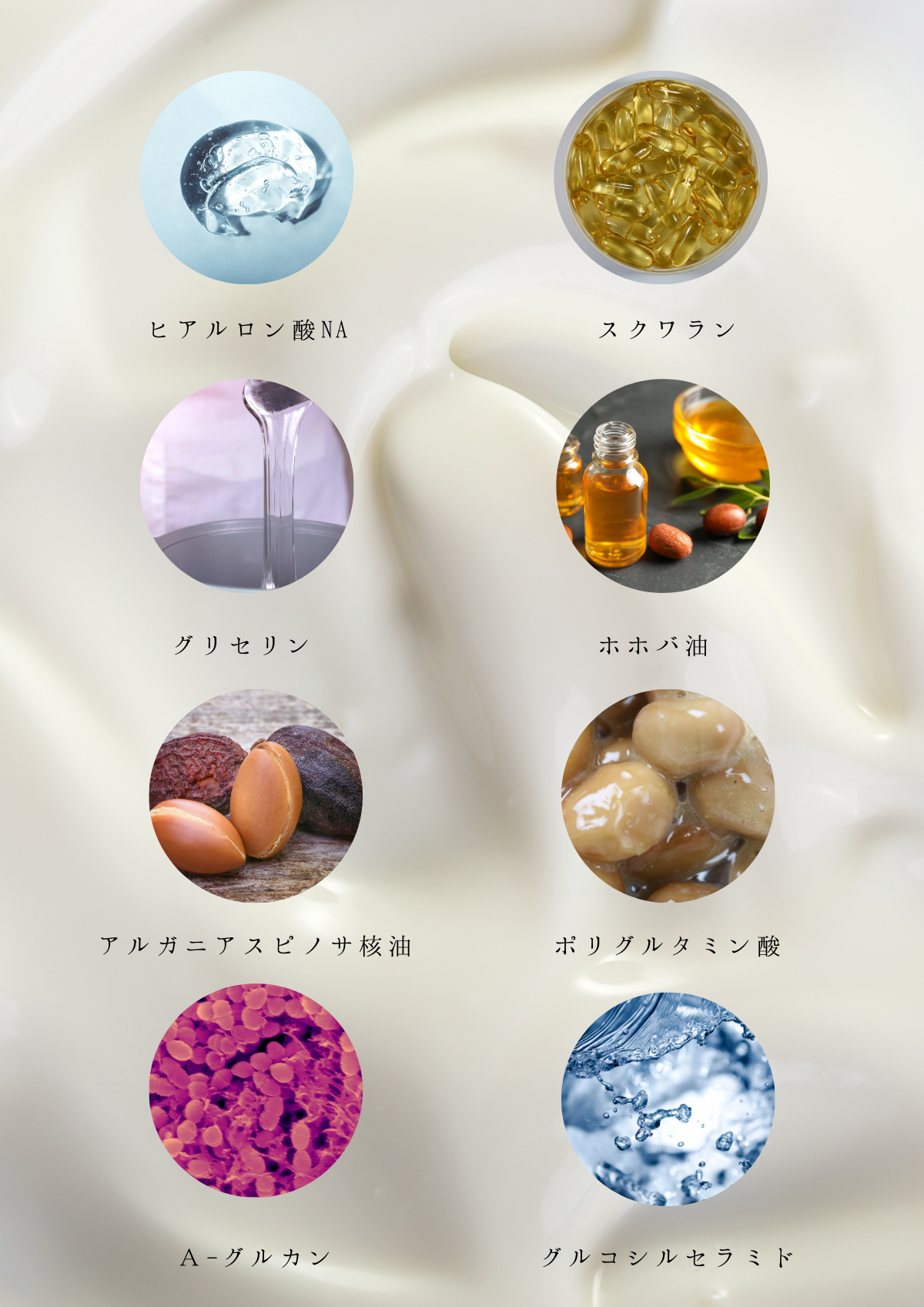 アルガニアスピノサ核油・・・さらっと軽いテクスチャーで、しっとりとうるおってしなやかな肌に。