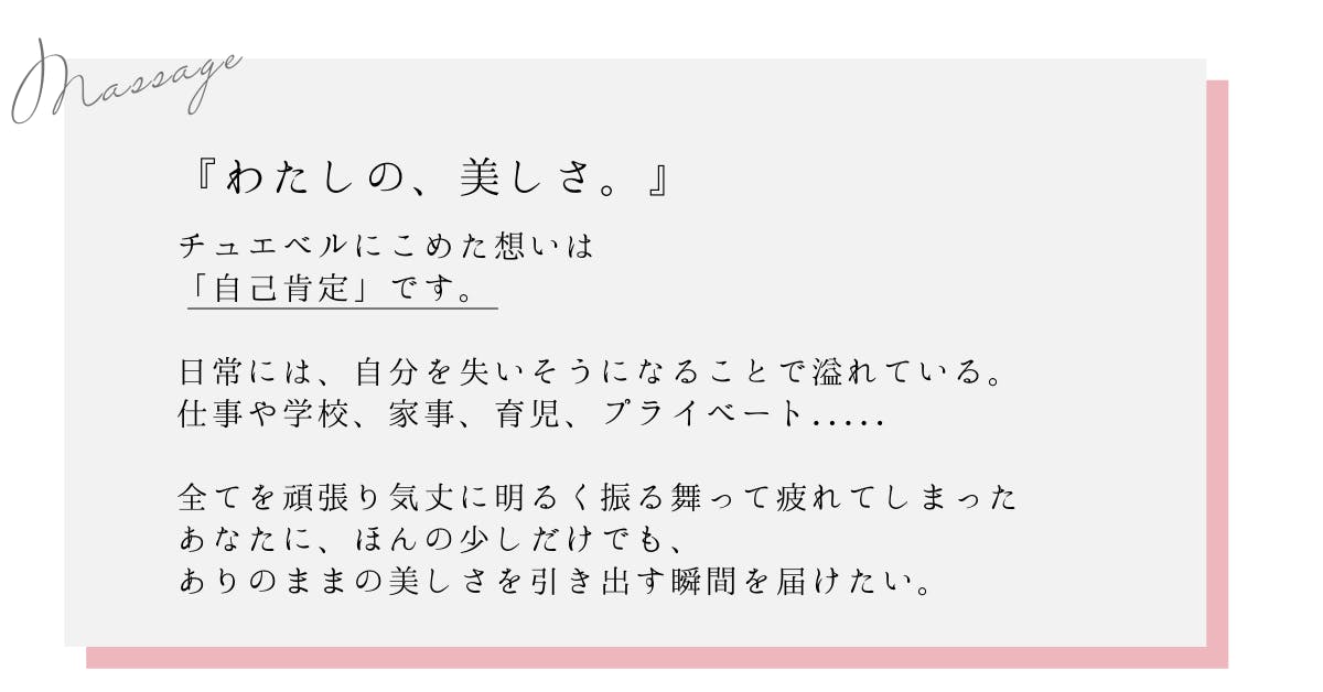 わたしの、美しさ。『Tu es Belle|チュエベル』は、"美しさ"をテーマとし、日々明るく振る舞って疲れている女性が、昨日よりもほんの少し自分を好きになるために生まれたライフスタイルブランドです。