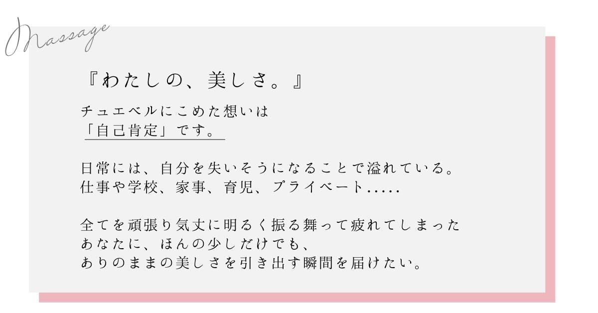 わたしの、美しさ。『Tu es Belle|チュエベル』は、"美しさ"をテーマとし、日々明るく振る舞って疲れている女性が、昨日よりもほんの少し自分を好きになるために生まれたライフスタイルブランドです。
