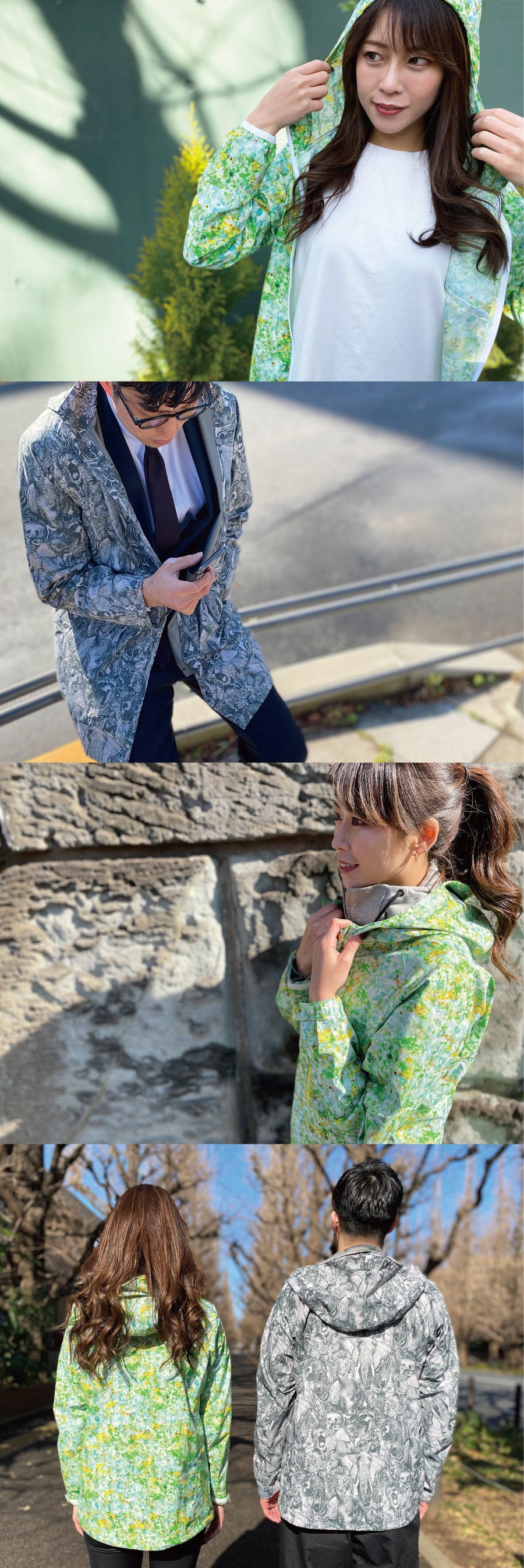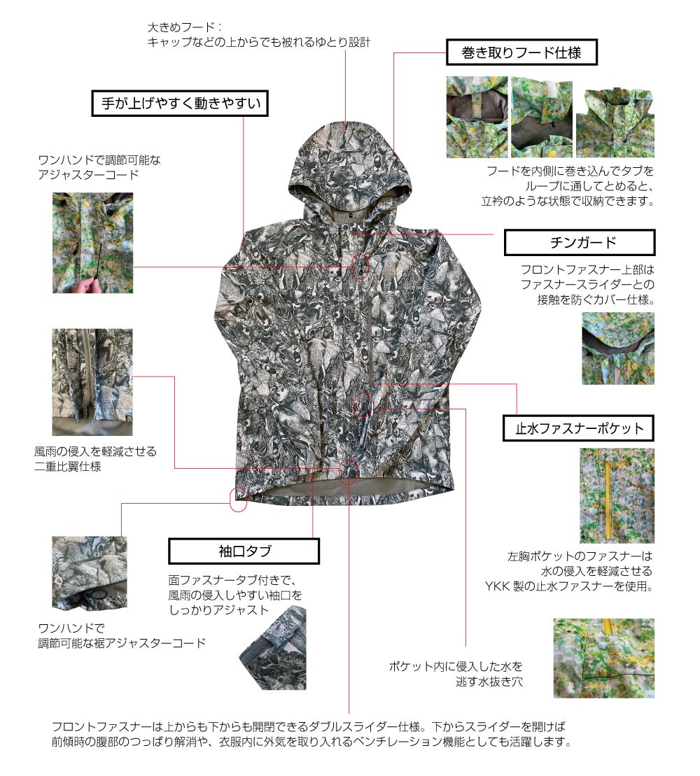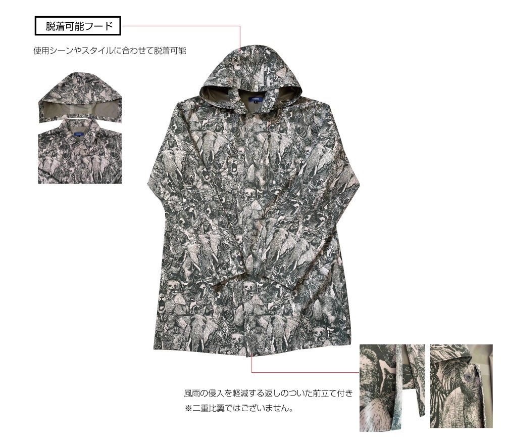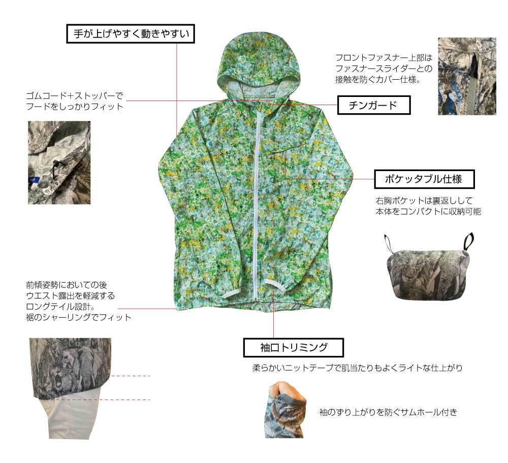 世界でも有数の「生地・製品から再生する技術」で作られた再生ポリエステル素材RENU®︎に、メッセージ・世界観を前面に出したnowartt Piece of The EARTHのテキスタイルデザインを乗せ、テックワン(石川県)の最高級品質の特殊フィルム・加工で防水性・透湿性・撥水性を極限まで引き上げ、匠の技術が継承されるオンヨネ(新潟県)の工場で縫製という、環境配慮、デザイン、高機能、伝統技術の要素をふんだんに盛り込んだ本格レインウェアを開発しました。レインウェアとしての機能を兼ね備えていることはもちろんのこと、ファッションとしてのタウンユースやアウトドア向けにも最適な逸品です。