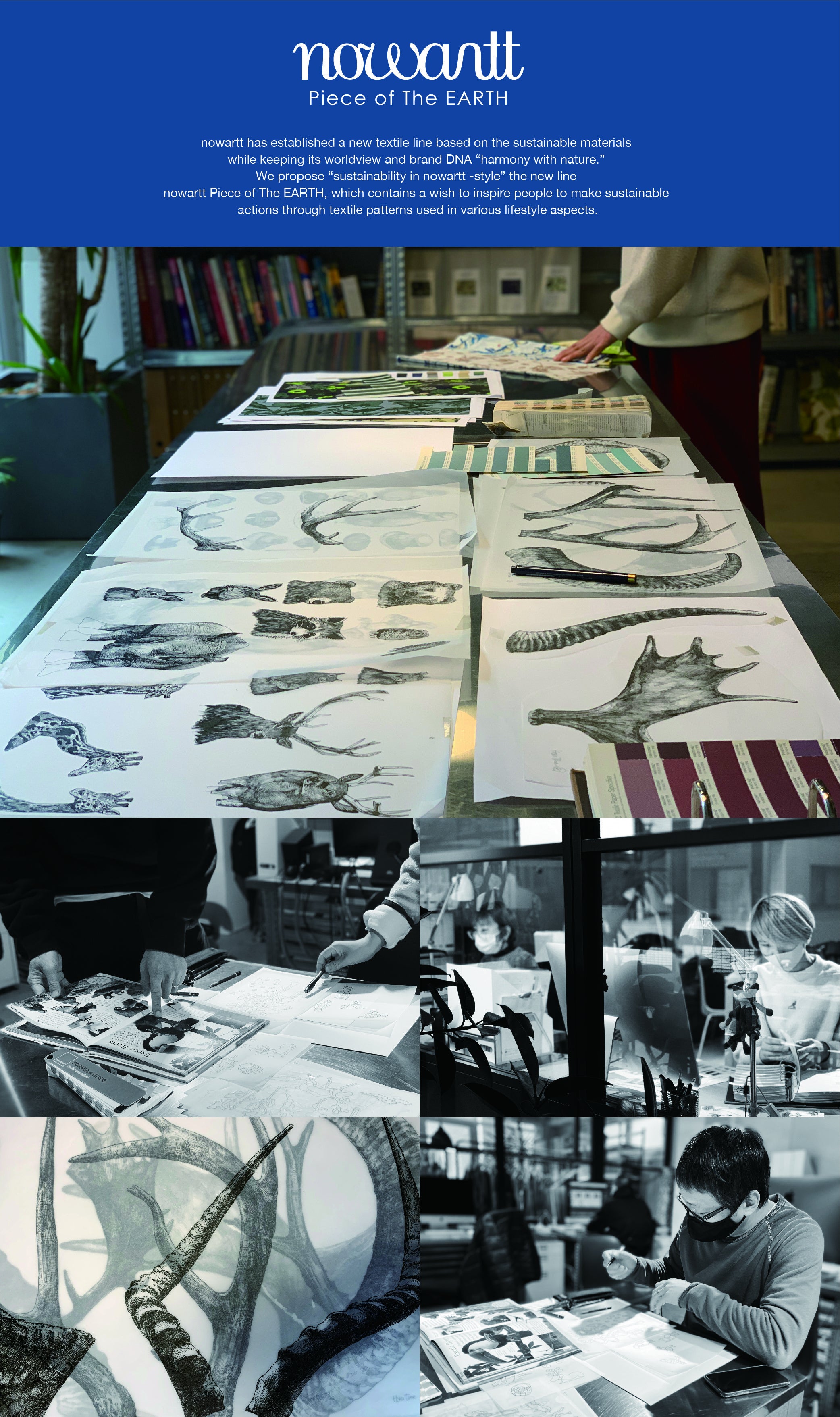 自然との調和・共存、環境への配慮というメッセージ性を強く持ったnowartt Piece of The EARTHのテキスタイルデザインに、環境配慮素材・高機能/品質を兼ね備えた製品を皆様のお手元に届け、少しでも環境・地球、絶滅危惧に瀕している動植物のことを考えるきっかけの一つになれば嬉しいです。