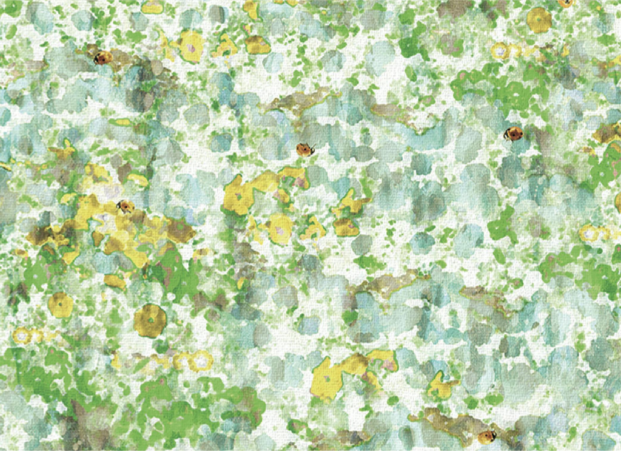 ゆらゆらと揺れている花や葉は、水の中の花畑を表現しています。てんとう虫などの昆虫もその世界に魅了され集まってきているイメージをデザインしています。