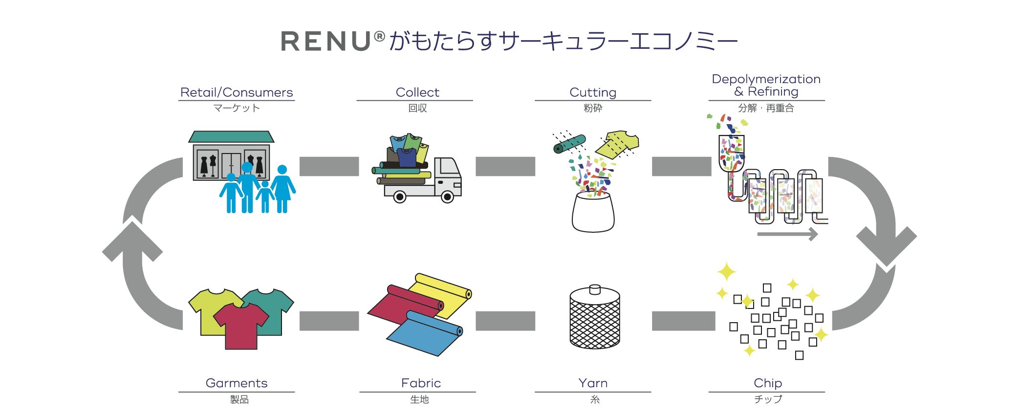 RENU®︎プロジェクトに参加すること、それはつまり"繊維から繊維"へという新しい生産システムの創造に貢献することになります。