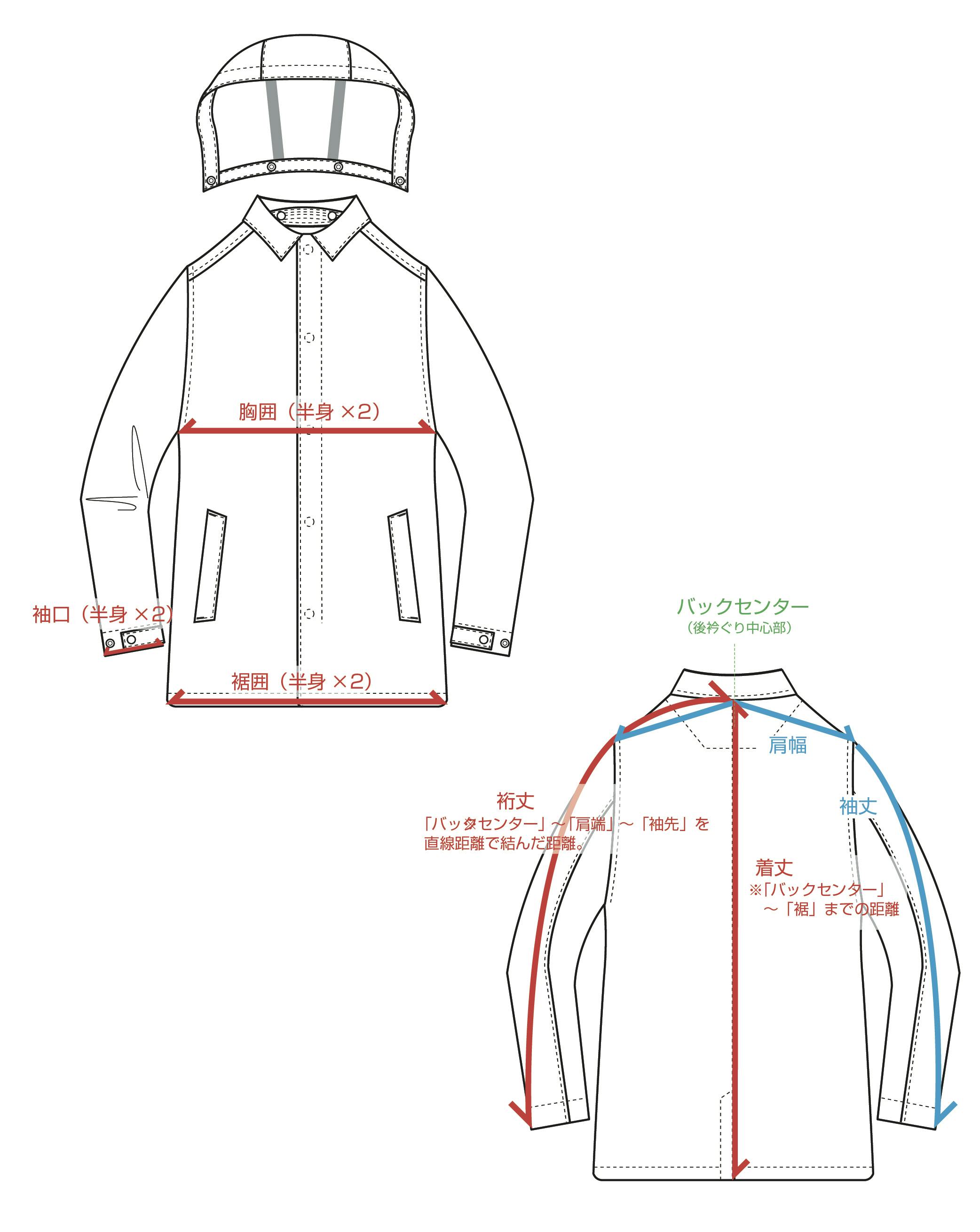 A5.ご参考として、主要部位ごとの寸法と、サイズの異なる各モデルが着用した際のサイズ感画像を上記に表示しておりますので、ご参照ください。