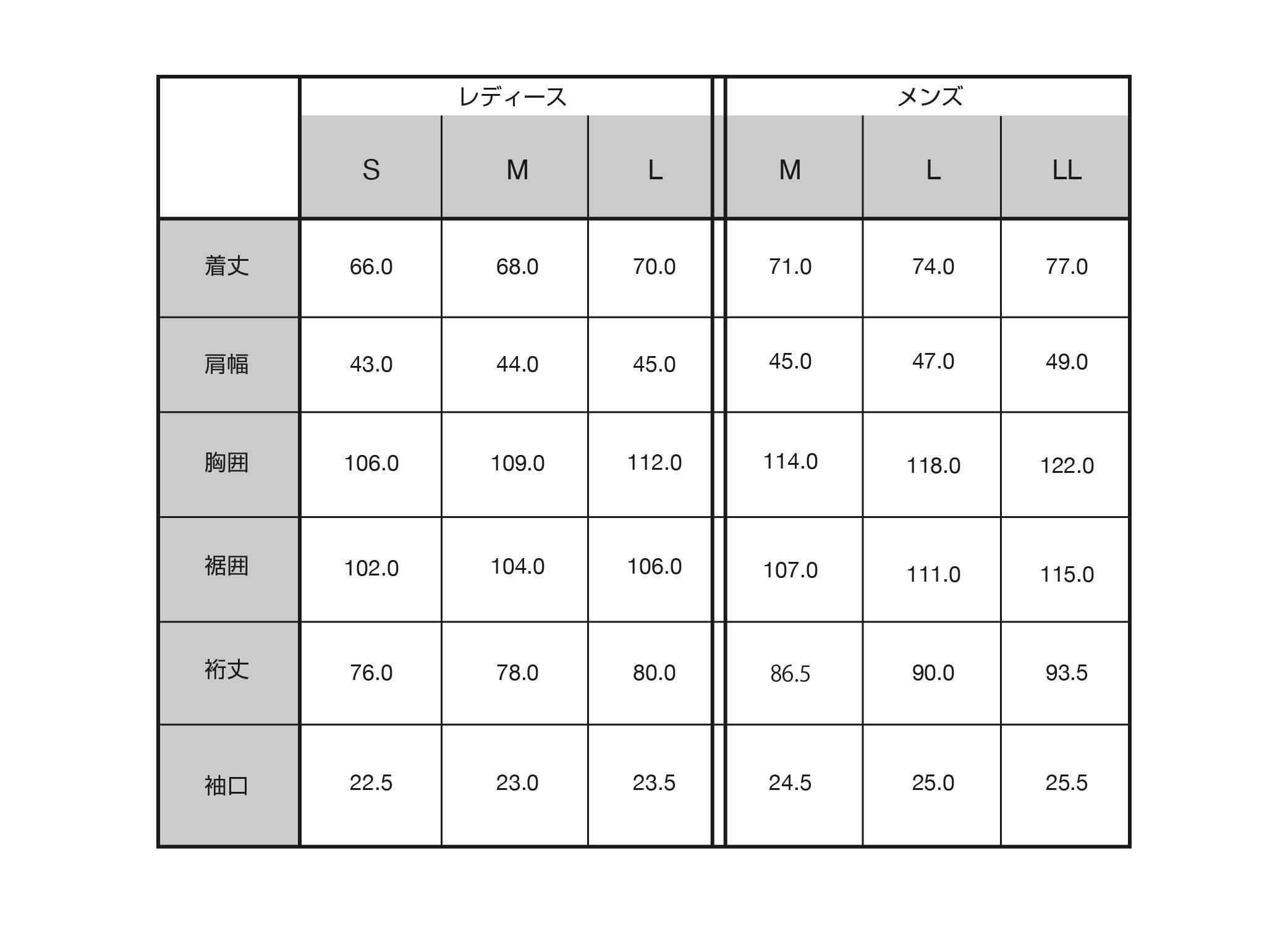 Rain Coat(Unisex) サイズ表