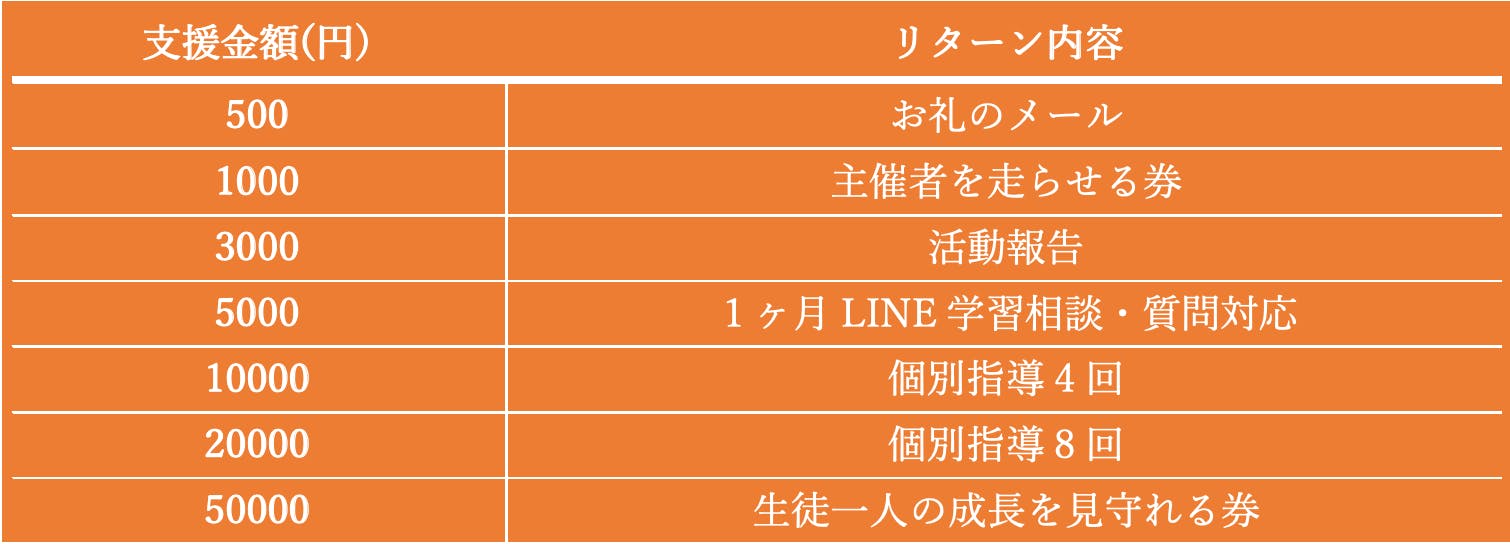 ※生徒1人は44600円(機材費込み)のご支援で2か月間勉強することができます。