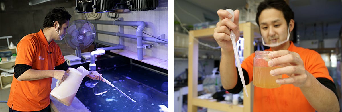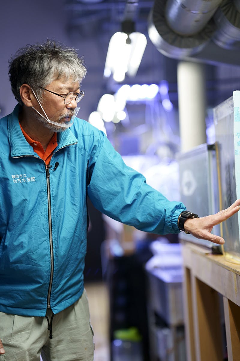 閉館の危機に直面する状況の中、企画展として『生きたサンゴと珊瑚礁の魚展』を開くことに。その準備をしていた際、偶然、サンゴの水槽に3~4mmの小さな生き物が30個体程泳いでいるのを発見。それがサカサクラゲの赤ちゃんでした。えさを食べさせ、500円玉くらい大きくなった段階で展示をしてみると、お客さんが大喜び。「そこからクラゲがおもしろくなりました」(奥泉館長)