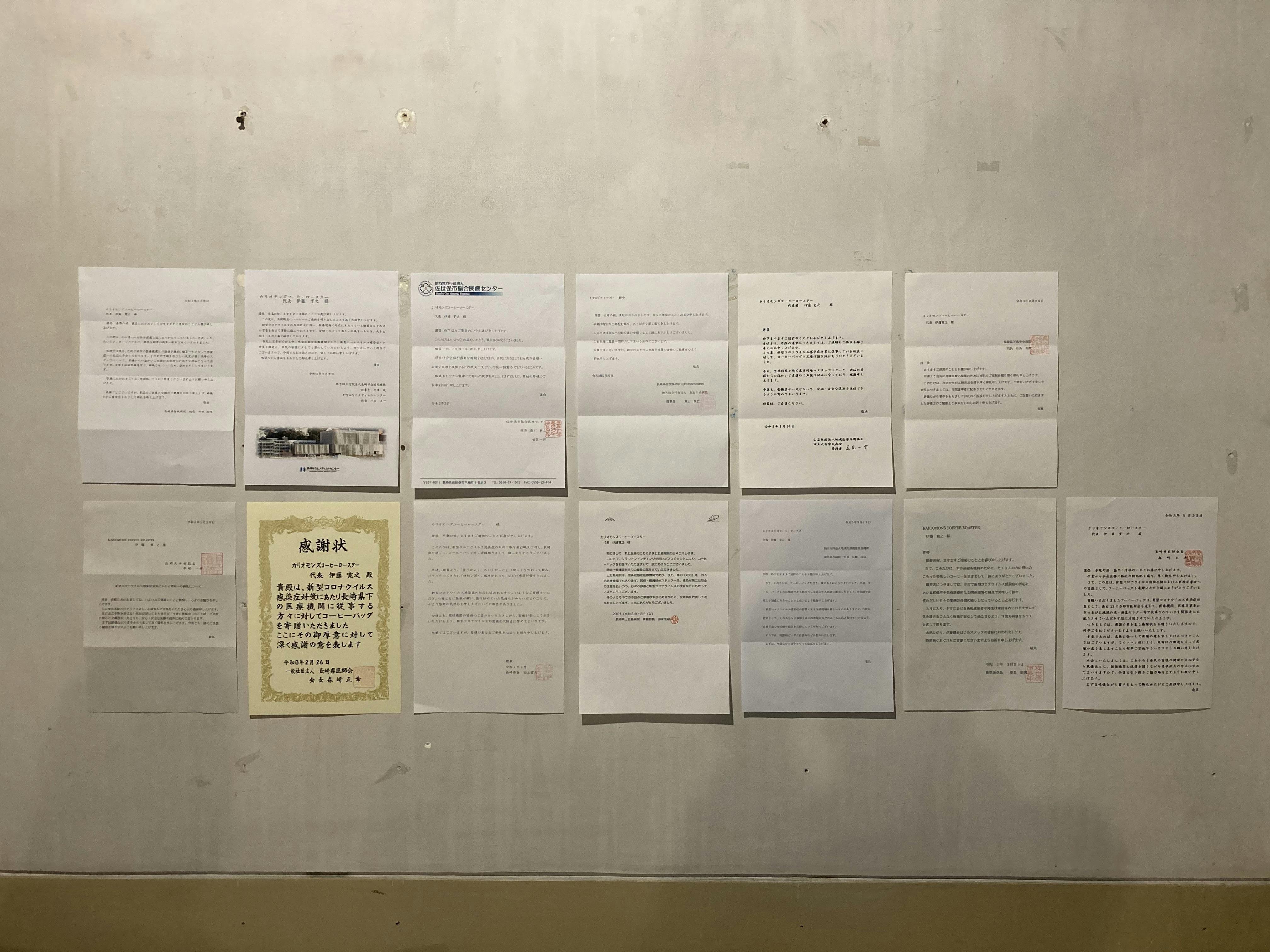 2021/04/08 18:29プロジェクトが終わりしばらく経ちますがみなさん変わらずお過ごしでしょうか?寄付をおこなった機関から続々とお礼状が届いています。書面でいただいたものについてはカリオモンズコーヒーの長崎店にて貼り出しています。4月23日まで掲示していますので、ご来店の際にぜひ読んでください! もっと見る