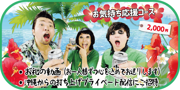 ★メンバーから心をこめてお礼の動画を送ります。また、最終日の沖縄より打ち上げプライベートツイキャス配信にご招待いたします。最後の夜、何が起きるのか?!ご参加しやすい金額でメンバーと打ち上げが楽しめるコースです。