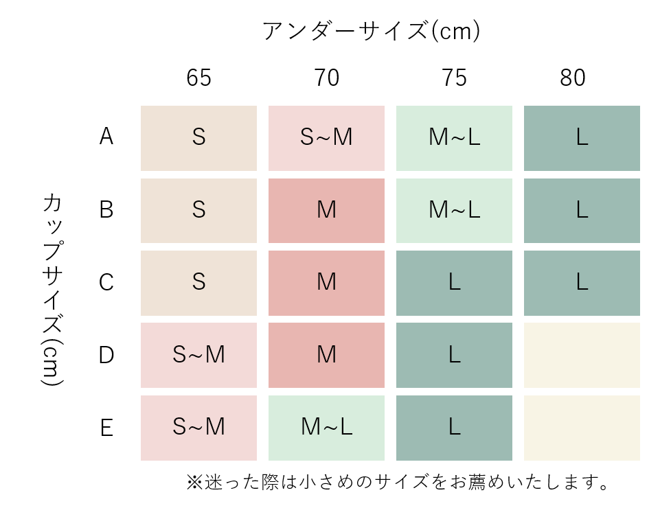 A: 下記サイズ表を参考にお選びください。締め付け感がないように伸縮性の高い素材を使っているので普段のブラよりも緩く感じる方もいらっしゃいますため、迷ったときは小さめのサイズをお薦めしております。