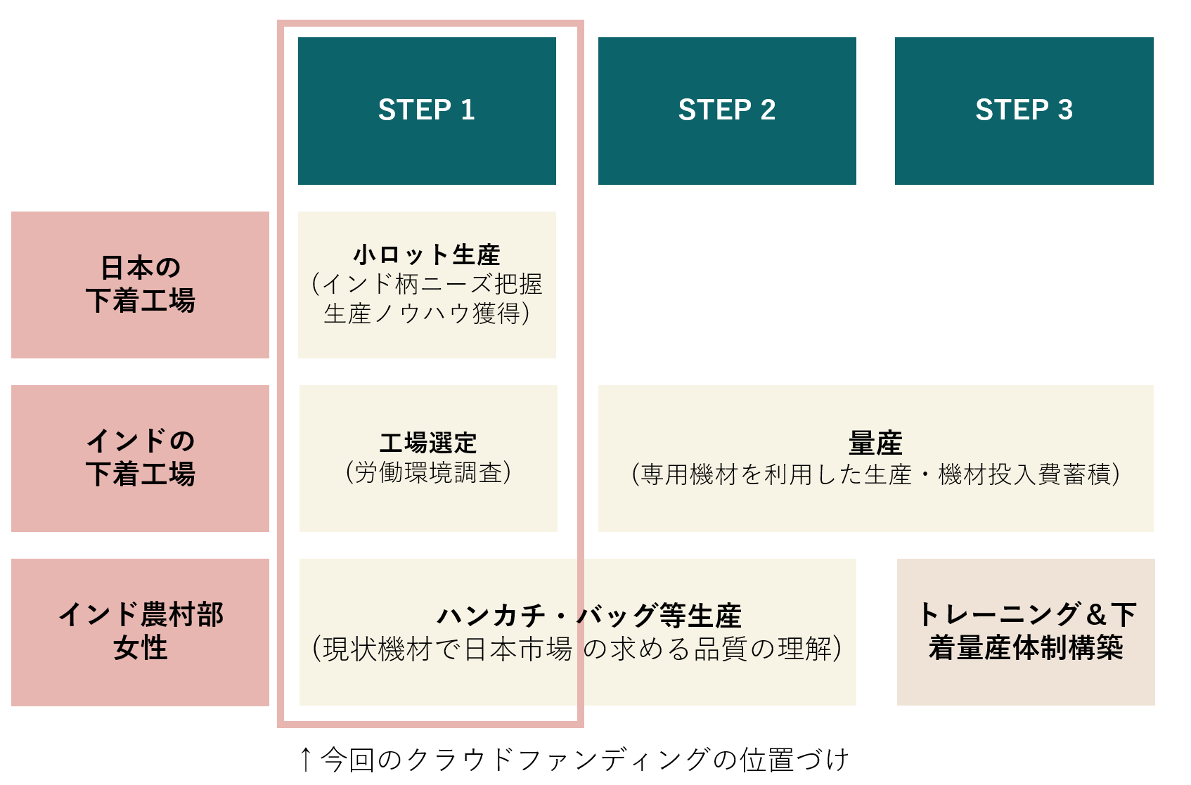 STEP 1: 日本のお客様向けに商品を発売し、ノウハウを蓄積する。農村部には、ハンカチ・バッグなどのリターン品の一部の生産を委託し、日本品質への理解を深める。(今回のクラウドファンディングはこちらの位置づけです。)