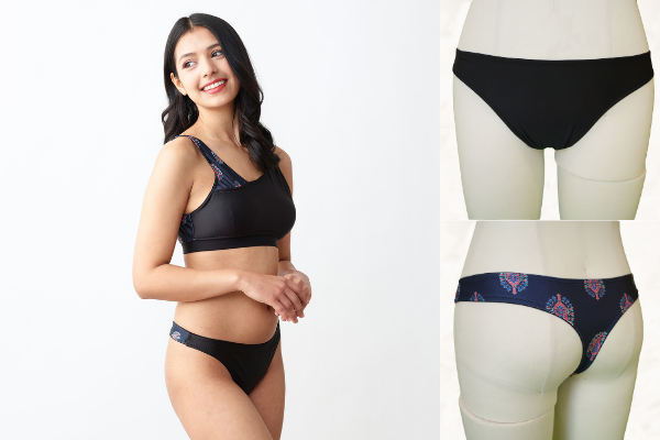 サリーブラ、おうちブラと同じペイズリー模様をあしらったショーツです。ショーツラインが目立たず、後ろ姿も綺麗に見せるソングタイプです。ソングが初めての方でも抵抗なく履いていただけるよう、ヘルシーなデザインに仕上げました。