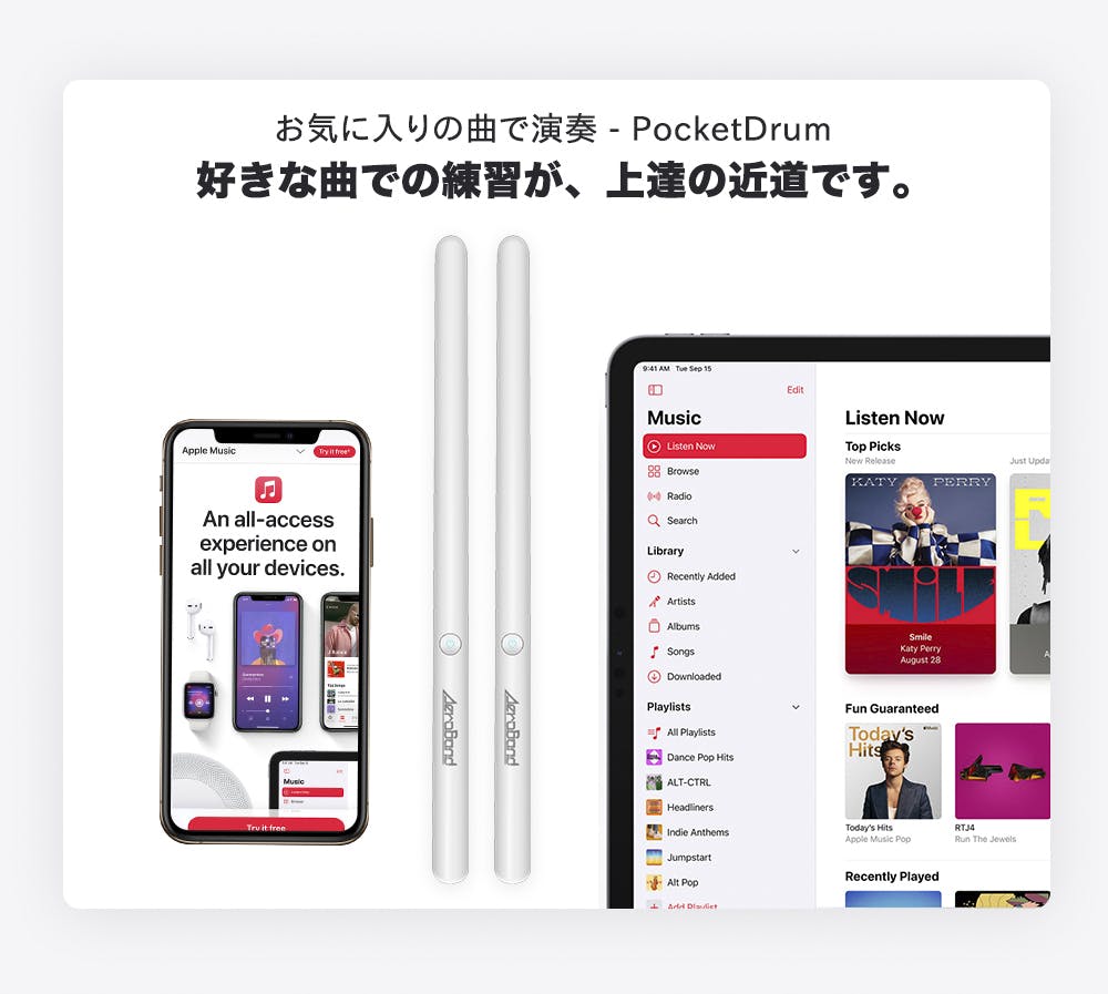 最大 3 か月間無料で Apple Music を利用でき、その間はすべての曲にアクセスできます。ドラム上達の近道は、自分のお気に入りの曲で練習することです。そこで、BGM (Background Music) 再生が可能な AeroBand アプリをご用意しました。これにより、Apple Music を起動したまま曲を再生できます (Android 版は Play ストアでダウンロード可能)。
