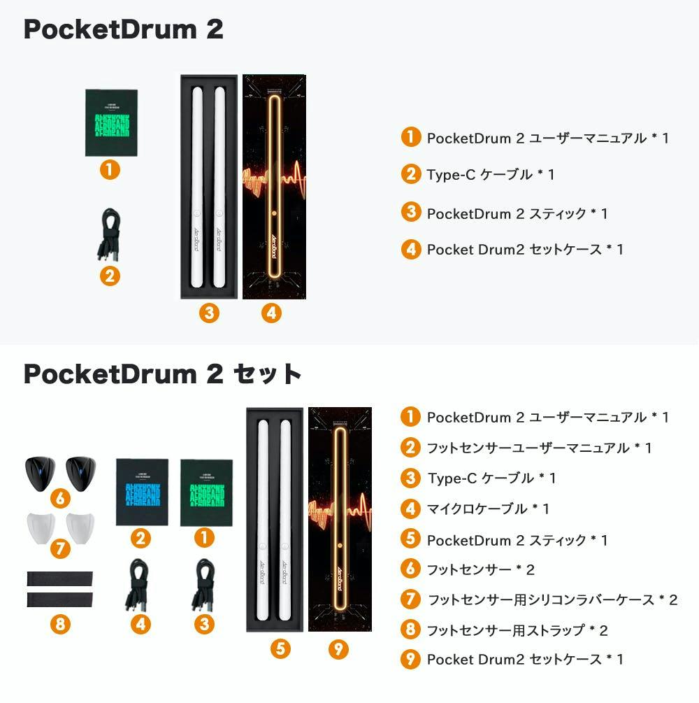 PocketDrum 2 は、クラッシュ、ハイハットシンバル (クローズ/オープン)、スネア、ベース、タム、ライドシンバルといった、ドラムの一般的なサウンドを完全に再現しています。スティックの動き方に合わせてさまざまなサウンドを再生したり、触覚振動フィードバックによって実際にドラムを叩いているような感触を得られたりします。サウンドとフィーリングが一緒となっているだけでなく、独自の慣性 AI チップと、三次元空間の動きを正確にキャプチャする空間計算アルゴリズムを使用しているため、驚くほどリアルなドラミング体験が可能です。