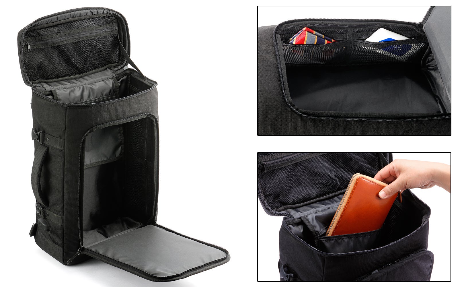 手提げバッグとして使える横持ち用ハンドルを装備し、ビジネススタイルにもフィットします。またキャリーオンストラップを装備しているので、スーツケースを伴う出張にも有効です。さらには飛行機内持ち込みOKの条件を満たすサイズ(三辺合計115cm以内)設計で国内線、国際線でもご利用いただけます。