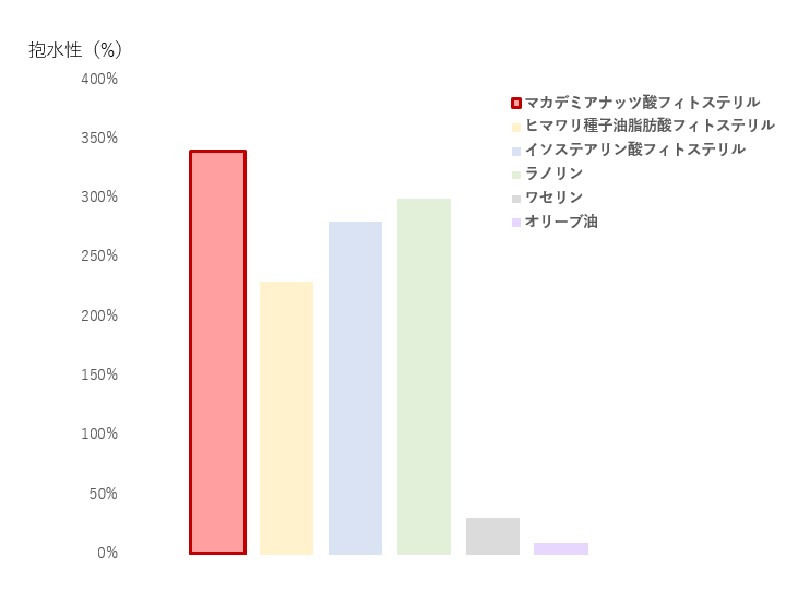 他の代表的な保湿成分と比較してもここまでの大差がつくほどの圧倒的保湿力(=抱水性)。