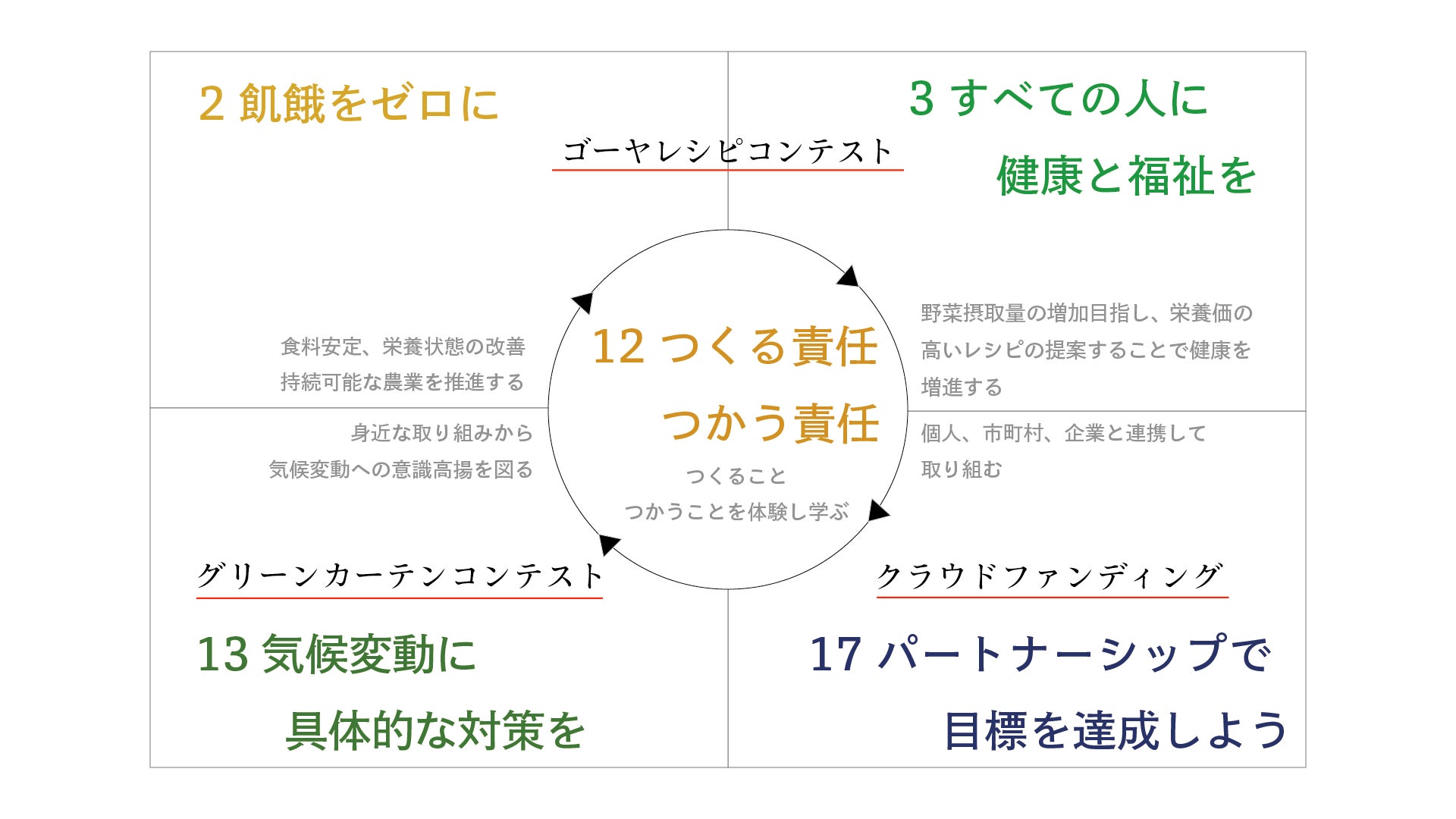 私たちの未来をより良くするために、SDGsに多くの人を巻き込んで取り組みたい!SDGs(持続可能な開発目標)とは2030年の、私たちの未来をより良くするための目標(Goals)ということで、17の目標が設定されています。最初はあまりにも漠然としていて、しっくりこなかったのが正直な感想です。しかし、身近なことから始めることが大切と知り、私たちが研究している「ゴーヤ」を活用できないかと考えました。地域の課題を考え、ゴーヤの「グリーンカーテンコンテスト」「レシピコンテスト」を開催することを決めました。この2つのコンテストは多くの人がSDGsへ取り組む最初のステップになると思います。