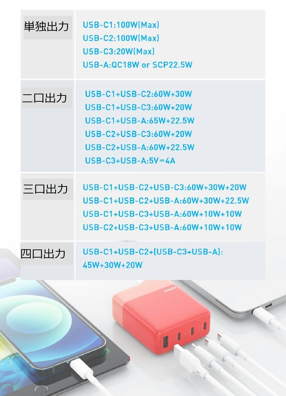 Type-C出力3つ、USB-A出力1つ、計4つの出力を持ち、4台のデバイスを同時に充電できます。