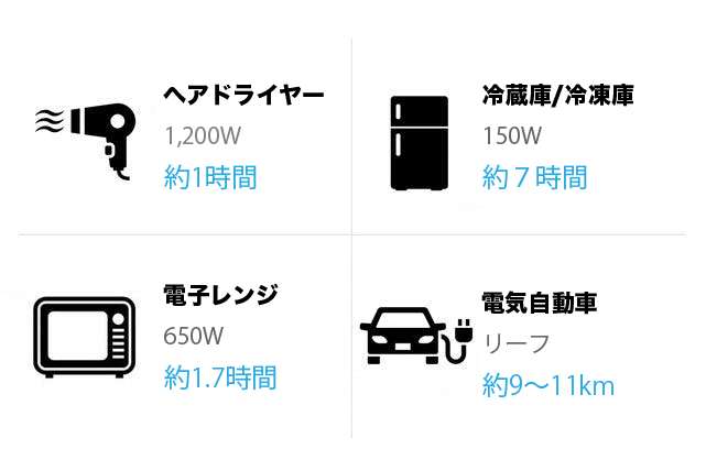 キャンプや車中泊でよく使用する小型冷蔵庫やノートパソコンはもちろん、電気自動車まで充電可能です!