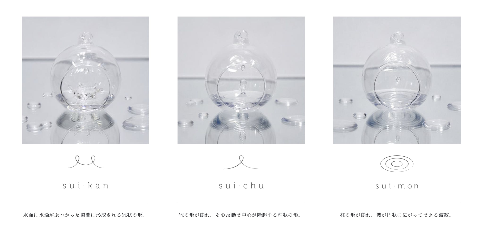 形は3段階あり、水面に水滴が落ちた瞬間にできる冠状の「sui・kan」、波の反動で柱状に隆起する「sui・chu」、その形が崩れて複数の波が円状に広がる「sui・mon」をそれぞれ制作しました。