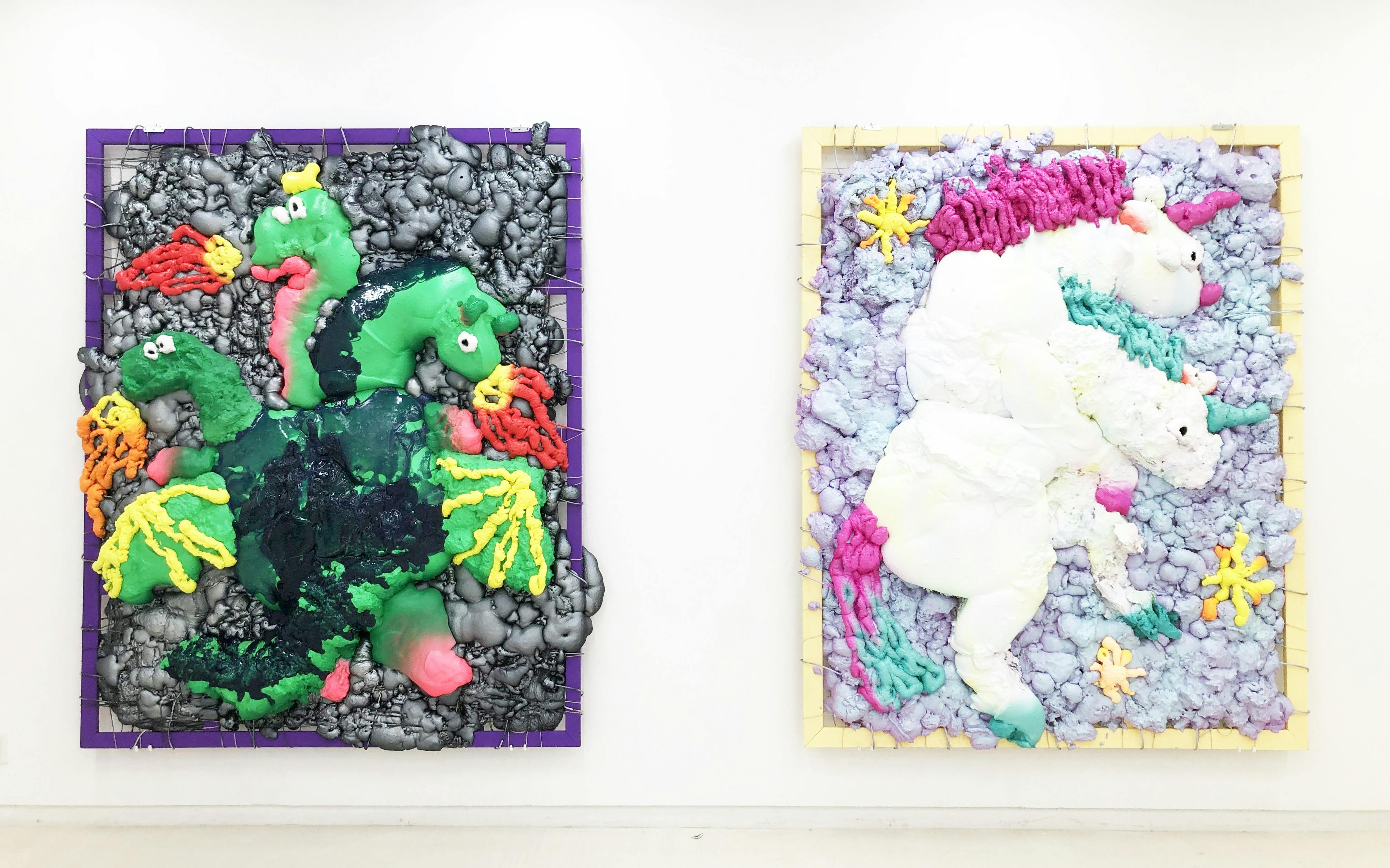 小さい頃、なんとなく欲しくて「チョコエッグ」をよく買ってもらいました。その頃は開けるのが楽しくて、中のおもちゃにはあんまり興味を持ってませんでした。でも大人になって中野ブロードウェイで見たオマケのフィギュアは全然違って見えました。そうしたものたちの素材や質感は、どこかちょっと歪な形で、ふにゃふにゃなところや、ちょっとダサくもありますが、そこがたまらなかったりもします。中には大きなソフトビニールのフィギュアとかもあって、とてもかっこいい。子供の頃は分からなかったけど、みんな、この良さに気付いてたんだと思いました。そこから影響を受け、大人も子供も楽しめるおもちゃの様なアート作品をコンセプトに制作しています。