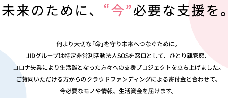 今回のプロジェクトでは、クラウドファンディングにて集めた寄付とJIDグループからの寄付を活用し